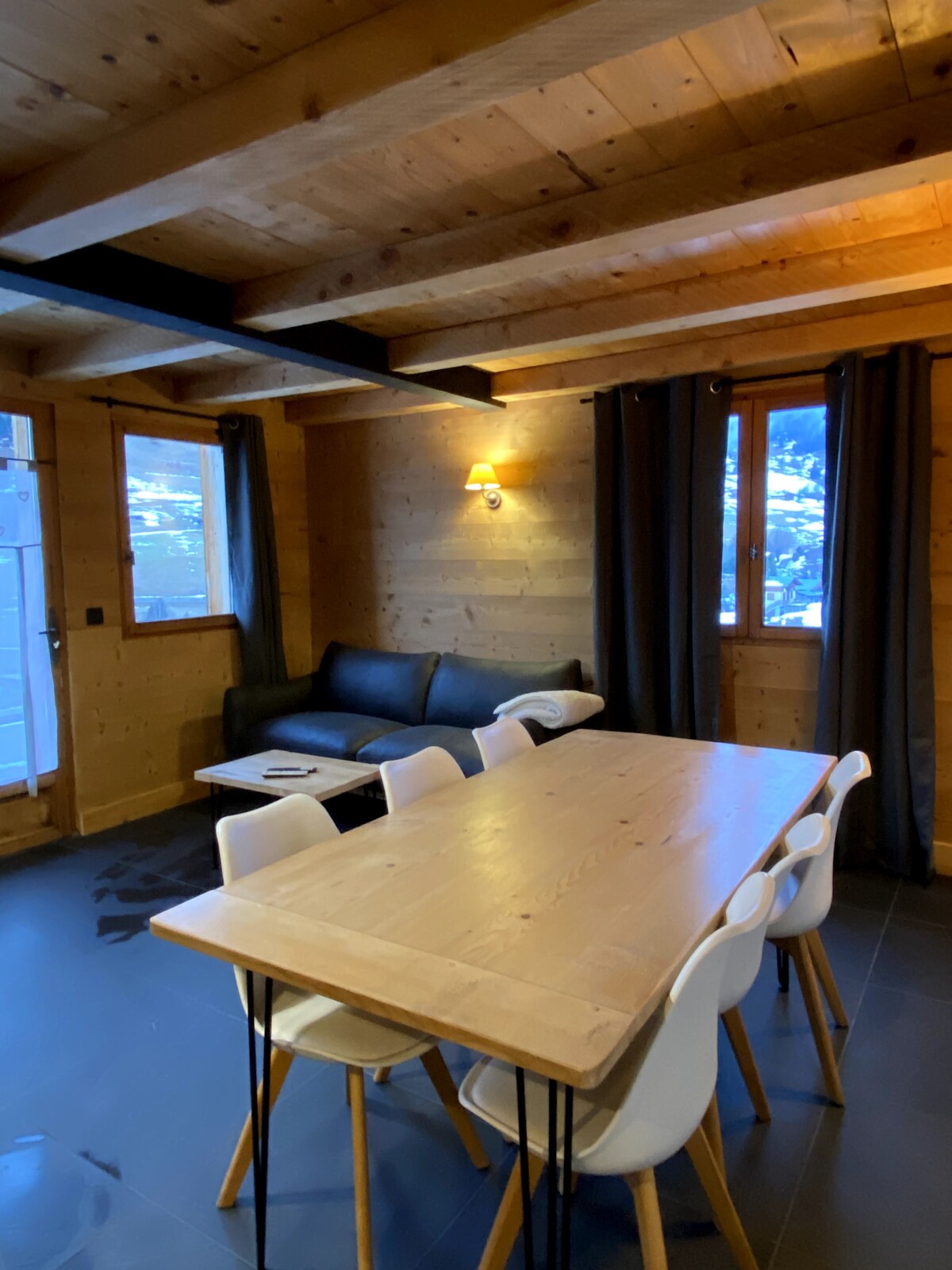 ALL-INCLUSIVE storitev (posteljnina/rjuhe/čiščenje) za 6 oseb v pritličju z 2 spalnicama (ena z zakonsko posteljo 160x200 in ena z 2 enojnima posteljama 90x190), nato pa v niši z 2 pogradoma (90x190). Zelo svetlo stanovanje, prenovljeno, v duhu gorske koče. Popolnoma opremljena kuhinja, odprta za dnevno sobo, vključno s prostorno mizo in kavčem, nato pa 2 fotelja. Gugalnice, miza za namizni tenis. Nordijska kopel »Storvatt«. Mirna nastanitev ponuja sproščujoče bivanje za vso družino.
