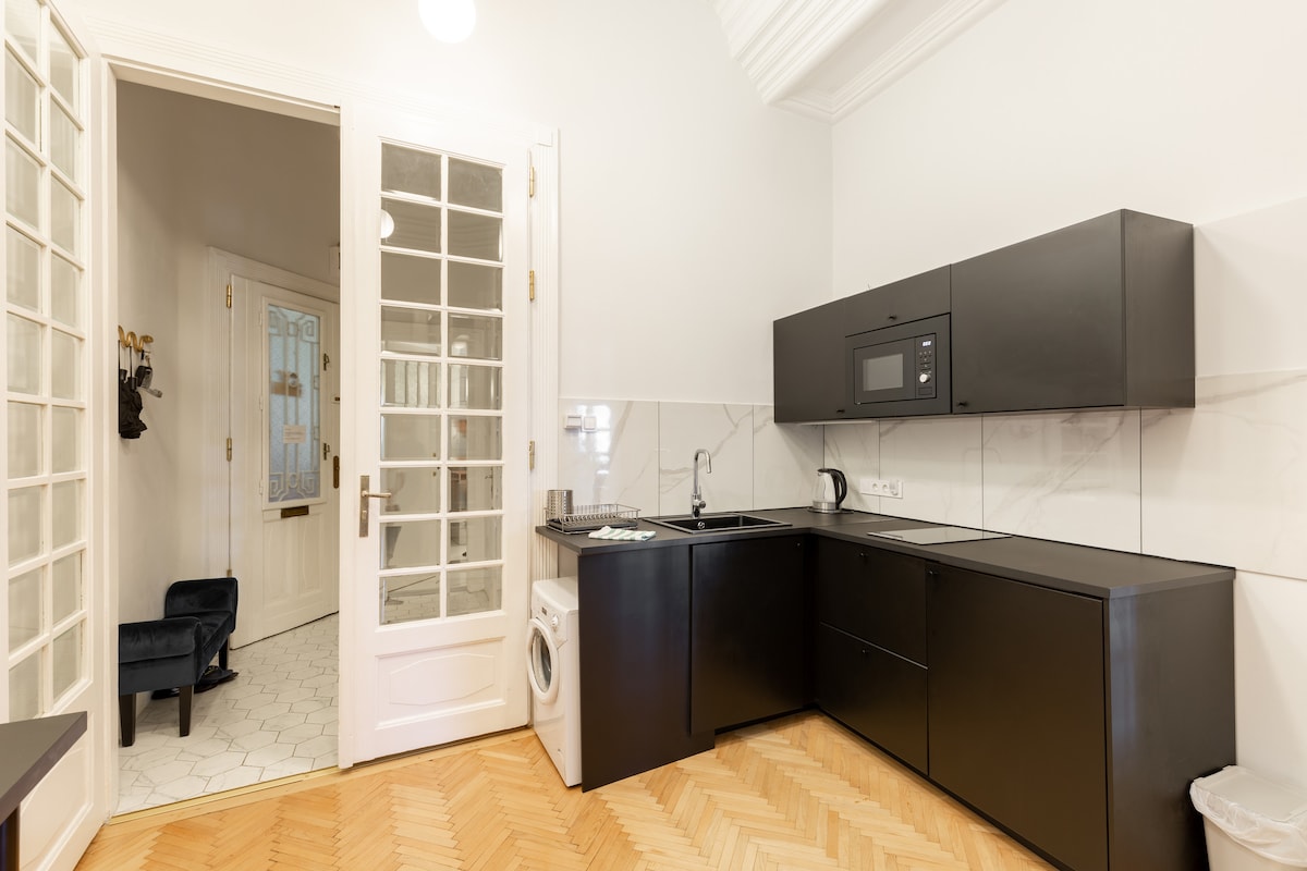 As another gem in our unique apartment collection, we present a brand new home away from home to the discerning Budapest visitor in an unbeatable location. It is stylish, luxurious, comfortable, and true to its environment and the architectural style of the building. It is one of the few genuine Bauhaus buildings in central Budapest, and while, of course, in a modernized way, we tried to stay true to many elements of this influential style when we created this unique apartment.