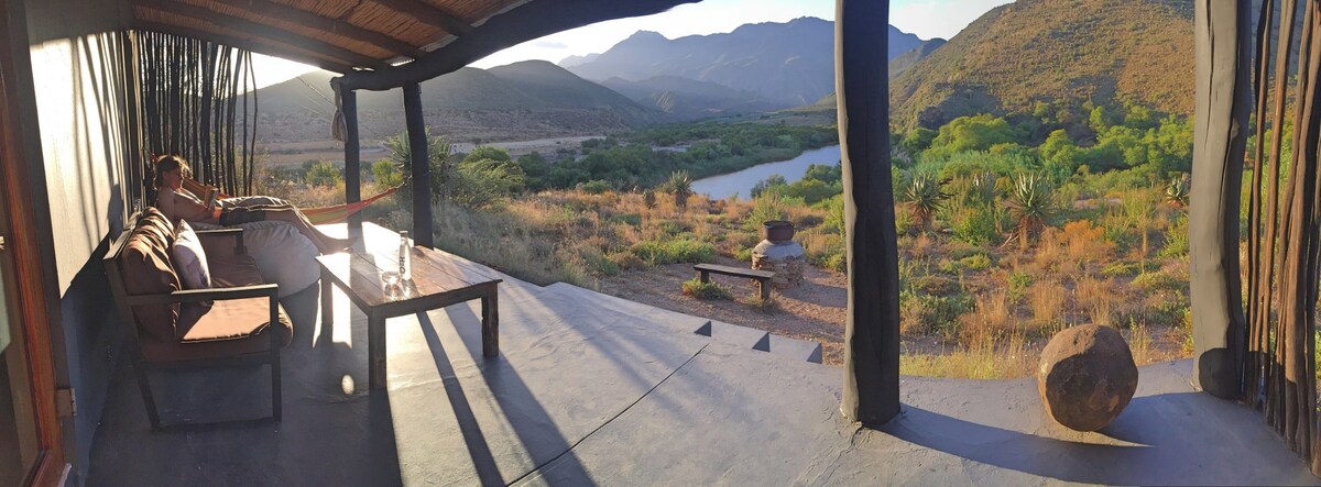 Tri hiške na deželi s pogledom na reko Gamka gledajo na pometalen ovinek. Hiške na deželi se nahajajo na kmetiji The River Farm v bližini Calitzdorpa v osrčju svetovne dostopne točke za biotsko raznovrstnost v Little Karooju. Vsaka hiška na deželi lahko sprejme par.