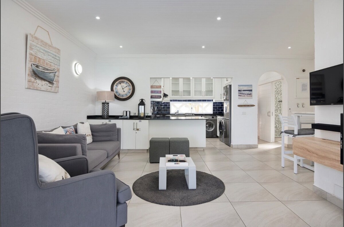 »Udobno« komaj opisuje eklektično vzdušje tega osupljivega stanovanja, ki se nahaja tik ob plaži, topel domač značaj tega majhnega dragulja, resnično najboljši sedeži v hiši za opazovanje delfinov in kitov, ki uživajo v morju in deskanju spodaj. Uživajte v očarljivem zunanjem žar, ki spominja na italijanski Village Piazzo. Vključeno za vaš užitek in udobje Netflix, Showmax, Fibre Wifi, pralni stroj, pomivalni stroj. BOLJŠE OD TEGA NE MORE biti!