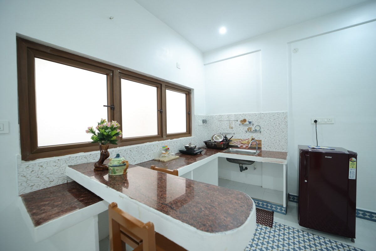 Serene Villa je vrhunsko prenočišče 1BHK, ki se nahaja le 2 km od živahnega območja White Town v Pondicherryju in ponuja popolno kombinacijo razkošja, udobja in miru. Ta elegantna vila ima prostorno spalnico, udoben dnevni prostor in popolnoma opremljeno kuhinjsko nišo, kar zagotavlja domače in sproščujoče doživetje. Vila, obdana z mirno sosesko, zagotavlja miren oddih, medtem ko je še vedno priročno blizu očarljivih francoskih kolonialnih ulic, kavarn in trgovin.