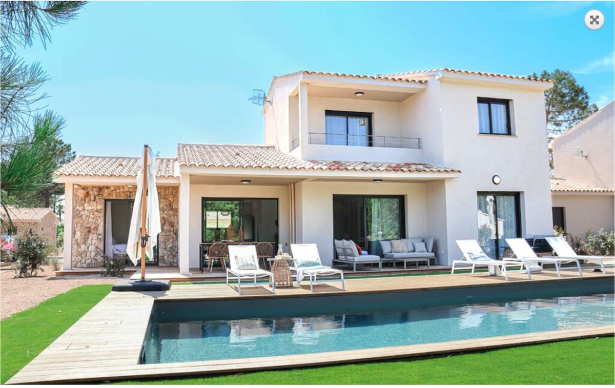 Ta čudovita nova vila s 4 zvezdicami in površino 176 m² ima neverjeten pogled na morje in gore ter zasebni ogrevan bazen Tišina, 10 minut od središča Porto-Vecchia in 15 minut od plaž Samostojna vila je opremljena s štirimi spalnicami in tremi kopalnicami. V vsaki sobi sta klimatska naprava in TV Poletna kuhinja, boulodrome, Wi-Fi internet, Nespresso aparat za kavo, zvočnik, plinski žar, ležalniki