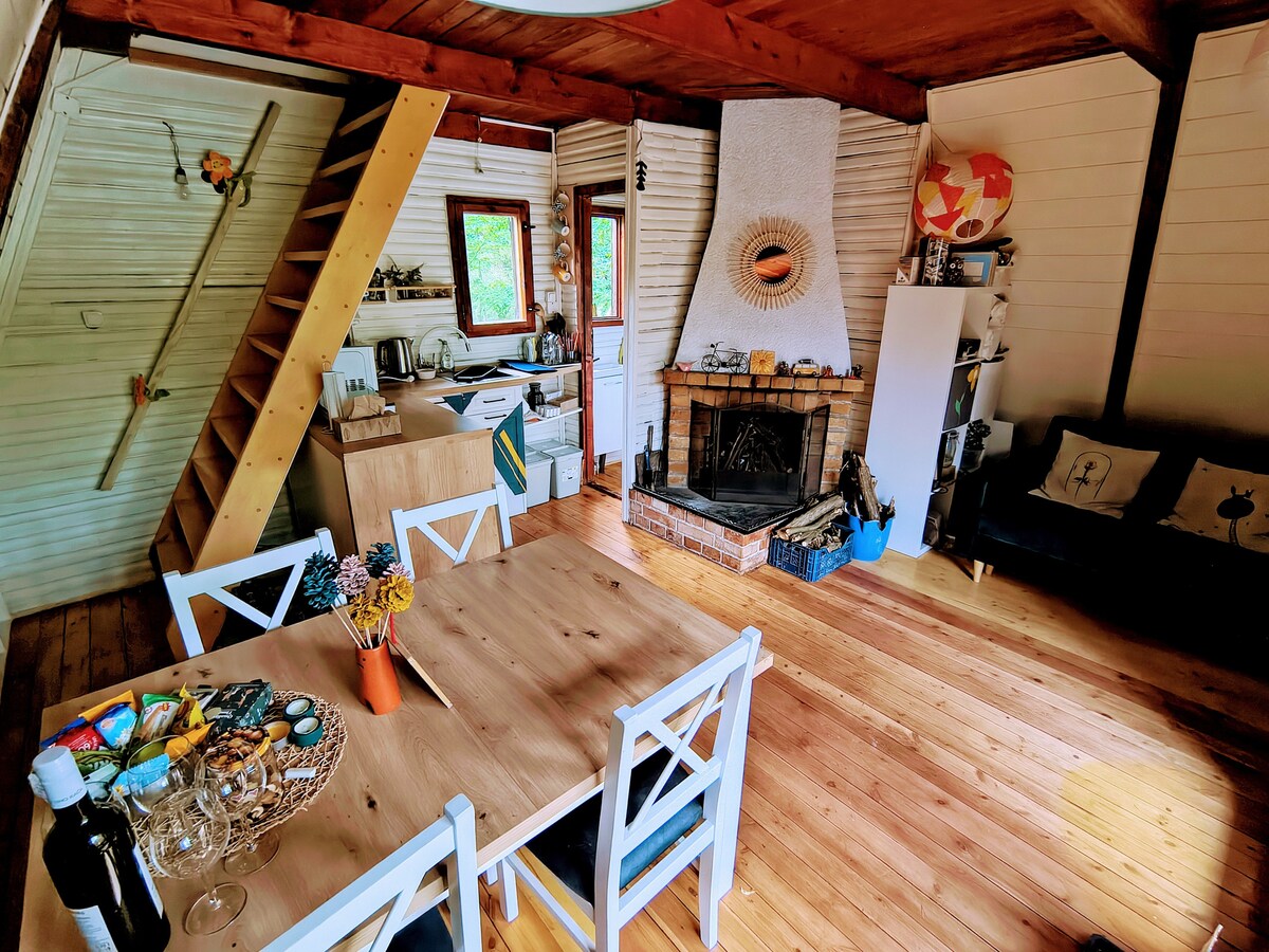 Our wooden house was made by my grandfather 50 years ago. It consists from living room with fire place, folding sofa bed for 2 persons, small kitchen, bathroom and on the first floor there is one bedroom with a king bed and 3 single beds. During your stay in our wooden hut you could see squirrels, forest birds, stag beetle, salamanders, hedgehogs, and different animals... deers come for visit sometimes. It is located in recreational area of Harmónia near Modra.