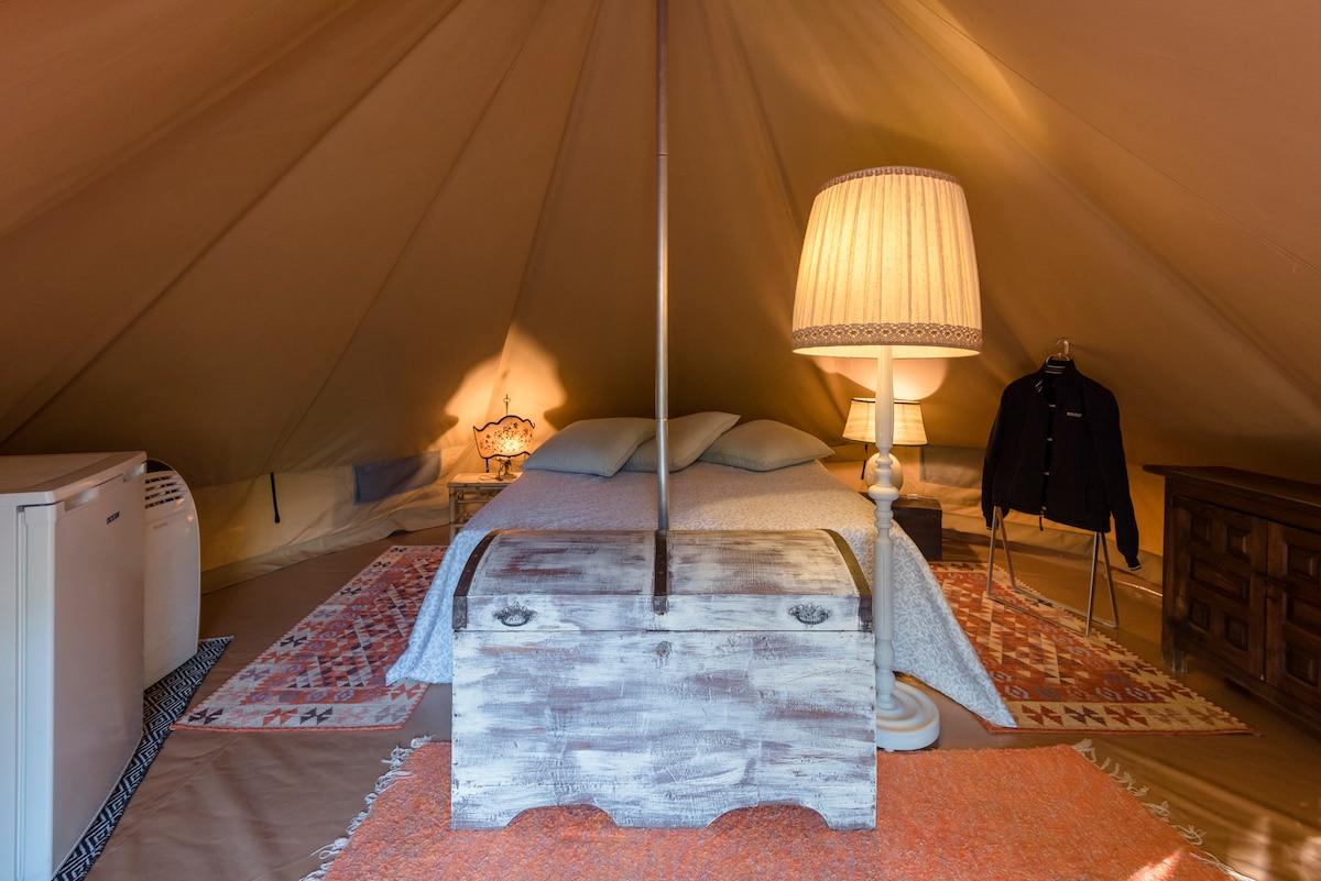Pod starodavnimi drevesi v čudoviti pokrajini je velik bombažni šotor, nameščen na veliki leseni terasi, z osupljivim razgledom. Šotor ima premer 5 metrov in je opremljen s posteljo za 2 osebi, 2 enojni postelji (če je potrebno), preproge na tleh, elektrika in voda. Šotor ima zagotovljeno vodoodpornost in debelina platna nudi zadostno zaščito pred vetrom. Pred šotorom je velika terasa z mizo, stoli in ležalniki.