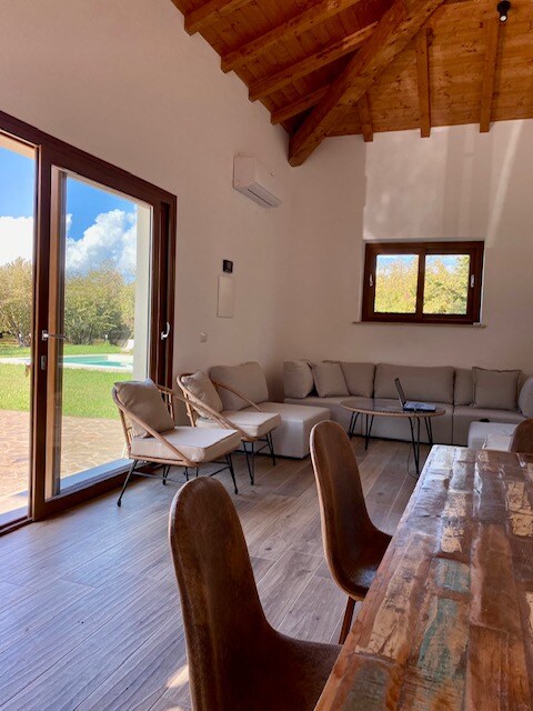 Vila, potopljena v oljčna drevesa z bazenom in žarom