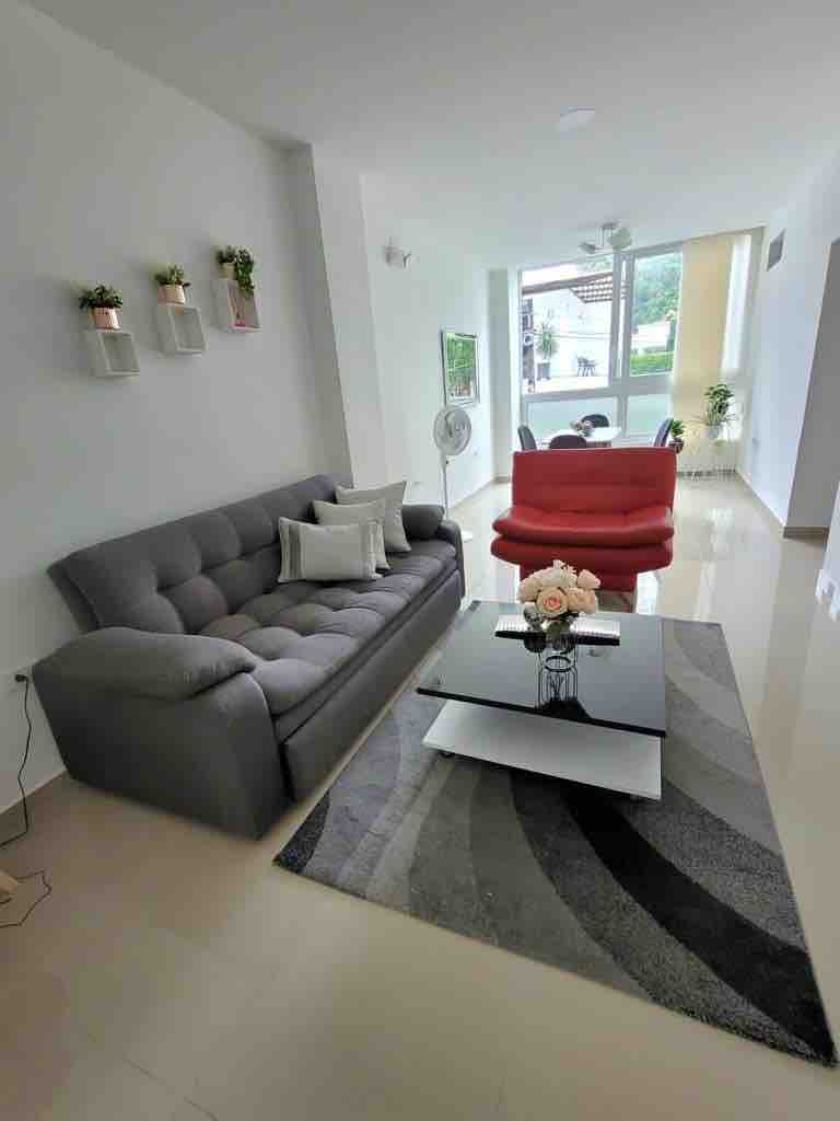 Comodísimo apartamento totalmente nuevo, perfectamente amoblado con aire acondicionado, doble balcón con vista a la ciudad y a sus hermosos atardeceres. Dos parqueaderos en el sótano con portón eléctrico. Muy cómodo y elegante. Edificio Inteligente y muy moderno. NETFLIX - AMAZON y TV CABLE sin limites