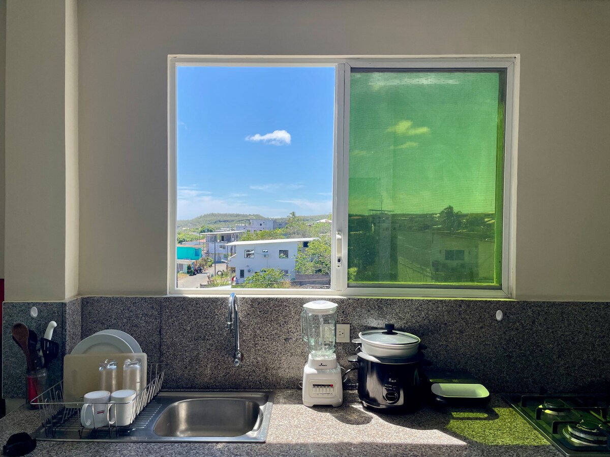 Stanovanje s pogledom na ocean se nahaja v središču mesta, na vrhu stavbe v 4. nadstropju - tri ulice/5 minut hoje od glavne obale in 3 minute hoje do kmečke tržnice in cenovno ugodnega igrišča za hrano. To popolnoma opremljeno stanovanje vključuje opremljeno kuhinjo (hladilnik, pečica, štedilnik, aparat za kavo, mešalnik, lonce in ponve itd.), jedilnico/dnevno sobo, ločeno spalnico in kopalnico ter zasebni balkon z visečimi mrežami in sedeži za ogled osupljivih sončnih zahodov v pristanišču Puerto Baquerizo.