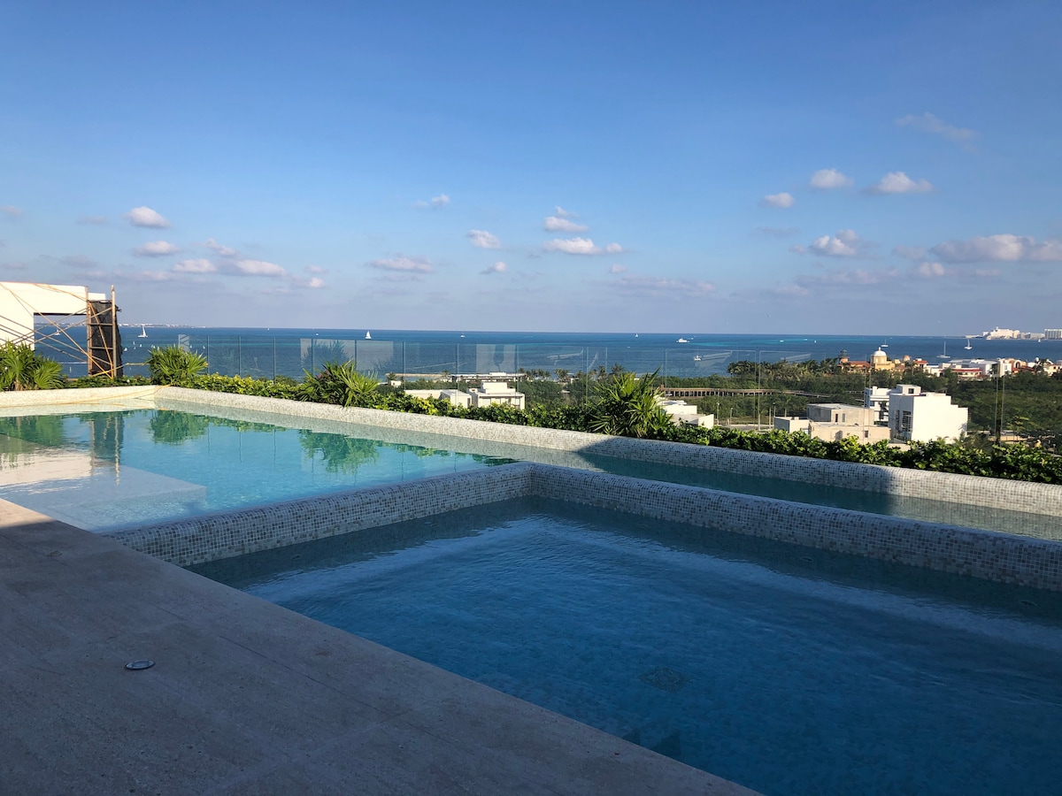 Vaše popolne počitnice se začnejo na RIVI To RAZKOŠNO stanovanje s 3 spalnicami in 3,5 kopalnicami ima vse, kar potrebujete Sprostite se v razkošju na skupni strehi s čudovitim pogledom na ocean s kristalno modro vodo Karibskega morja, Isla Mujeres, neskončni bazen, natakar (gotovinski bar) z masažno kadjo, stoli za bazen, žar, telovadnico, otroško igrišče, zunanji otroški park z gugalnicami, trampolin itd. Do plaže se lahko sprehodite z zasebnim peš mostom čez laguno. RIVA se nahaja v zasebni ograjeni skupnosti.