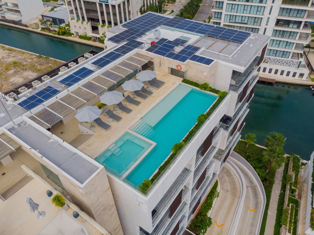 Stanovanje se nahaja v RIVI, v ekskluzivnem predelu v Puerto Cancúnu, imenovanem La Laguna. Na voljo sta bazen na strehi in masažna kad s teraso za sončenje, igralnica, telovadnica in pomol do navigacijskega kanala. Poleg tega uživa v prednostih in opremi, ki jih ponuja Puerto Cancún, kot so med drugim: igrišče za golf, klub na plaži, nakupovalni center, ki je med drugim oddaljen le nekaj korakov.