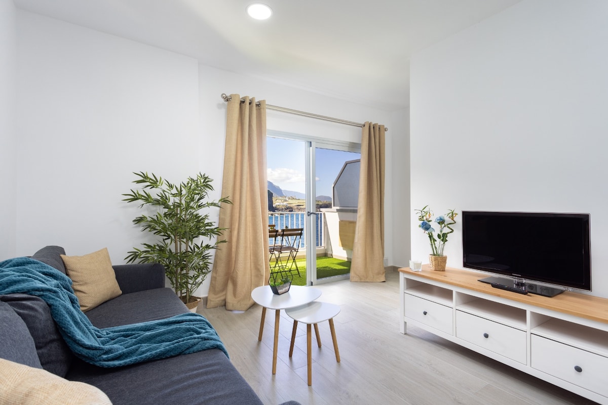 Confortable apartamento ubicado a primera línea de costa, con maravillosas vistas al mar y al acantilado. Buena iluminación natural y a pie de playa, es perfecto para disfrutar de la tranquilidad y el descanso. En la planta baja hay un restaurante donde podrás saborear diferentes menús. También hay farmacia, supermercado y parada de autobús muy cerca. El centro de la ciudad está a diez minutos, pudiendo visitar el drago milenario , ir de tiendas y degustar los vinos locales.