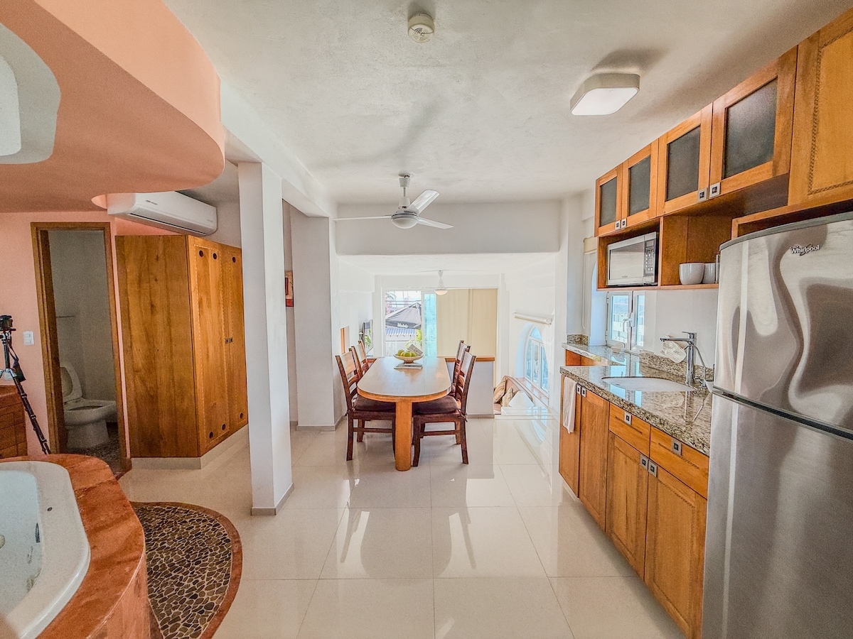🏖 Prostorna garsonjera, ki je le nekaj korakov stran od plaže – doživite pristno Vallarto! 🌴 Vključuje 1 spalnico s klimatsko napravo, 60-palčno televizijo, polno kuhinjo, kopalnico z vročo prho, dnevno sobo, jedilnico in zasebno teraso za sprostitev na prostem. Uživajte v izjemno hitrem omrežju Wi-Fi, ki je kot nalašč za delo na daljavo. V bližini romantične cone, hotelske cone, Malecóna ter odličnih restavracij in kavarn. Sprehodite se povsod in uživajte v pristni Vallarti, medtem ko bivate v mirnem, elegantnem in dobro opremljenem prostoru. Idealno za pare ali popotnike, ki potujejo sami.