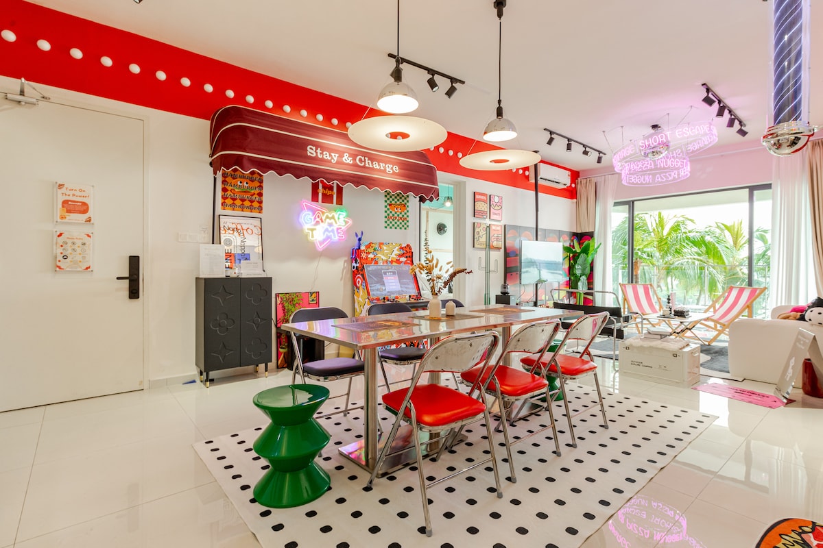 Zasebni luksuzni apartma | Hoja do trgovskega centra KSL • Nakupovalno središče KSL je dosegljivo peš • Futuristična zasnova, ki jo navdihuje cyberpunk • Zasebni masažni bazen za sprostitev • Poglobljeno kinematografsko doživetje z obdajajočim zvokom • Zelo velika zakonska postelja z 30-centimetrsko vrhunsko vzmetnico • raztegljiv kavč Ta apartma z drznim dizajnom, neonskimi poudarki in futurističnimi detajli združuje udobje z osupljivim kibernetskim vzdušjem. Idealno za pare, majhne poslovne ekipe ali majhne družine in nepozabno bivanje v središču mesta Johor Bahru.
