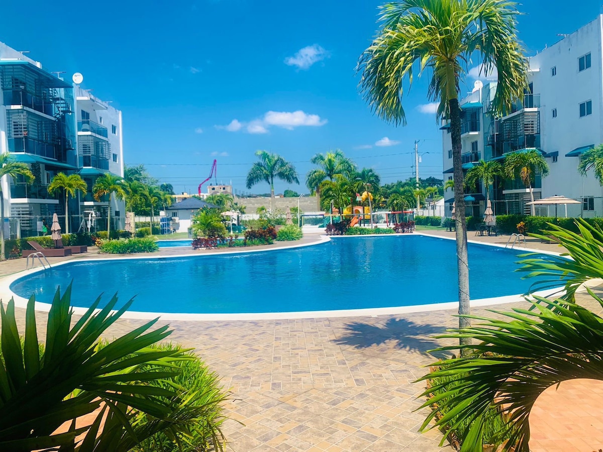 Acogedor apartamento primer nivel con vista a piscina. Diviértete con toda la familia en este alojamiento con estilo. El apartamento está cerca del aeropuerto internacional del Cibao. Es un Primer piso no hay que subir escaleras.