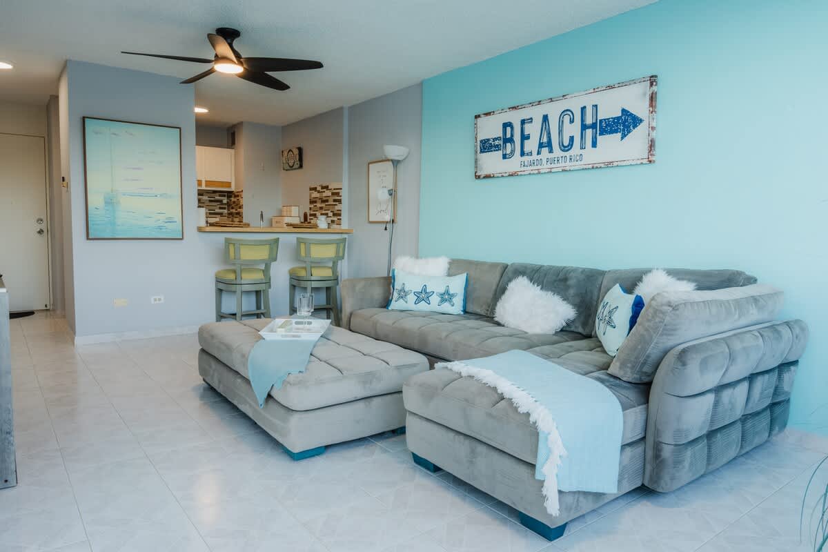 Azul Marino is our spacious one bedroom overlooking the east coast of Puerto Rico. Located inside a 5 stars resort, you have a golf course, 2 pools, hot tubs and be near the main excursions of Puerto Rico. Be minutes away from the bioluminescent bay, take a catamaran to the islands and enjoy a entire day at the beach doing snorkeling or just relaxing. This apartment had a full size kitchen, enormous living room and a very confortable king size in the bedroom.