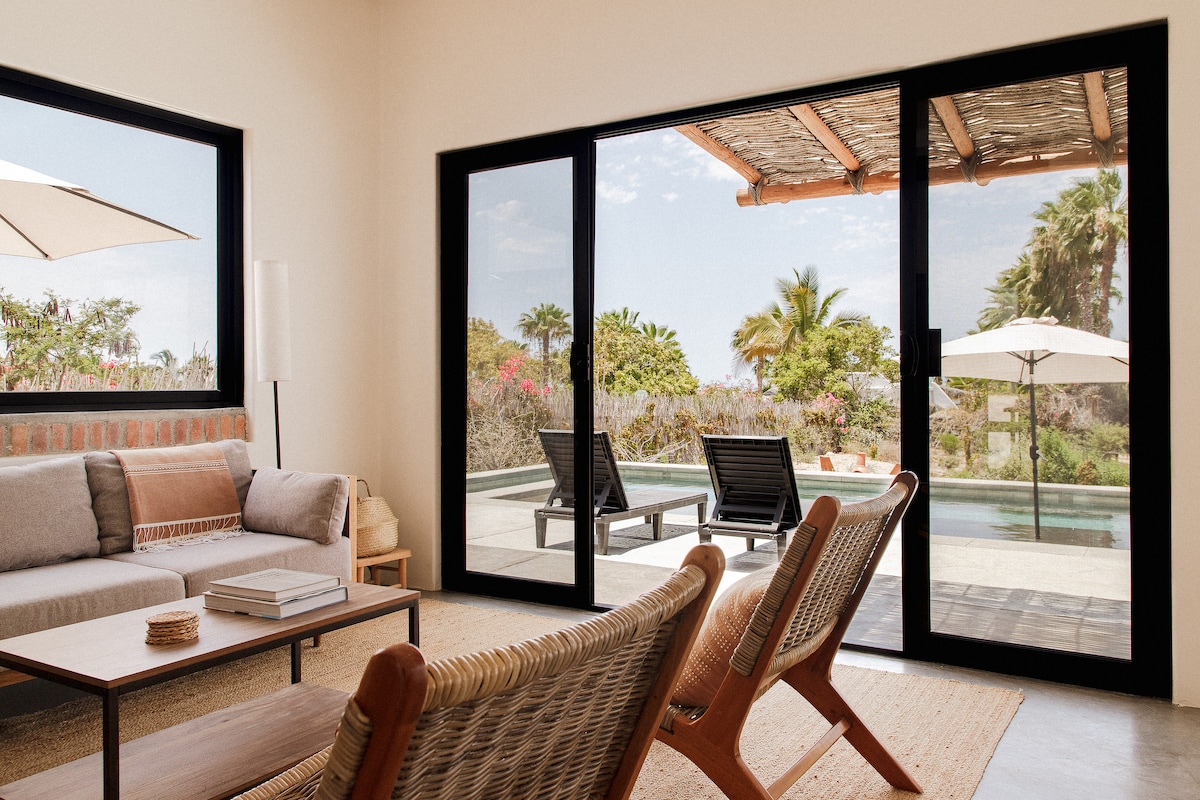 Charming one-bedroom casita just steps from the beach. Enjoy a large shared outdoor space featuring a spacious pool, sun loungers, and shaded lounging areas. The communal zone includes a grill, dining area, and gardens perfect for relaxing or entertaining. Ideal for couples or solo travelers seeking a peaceful coastal retreat with modern comforts and a laid-back Baja vibe.