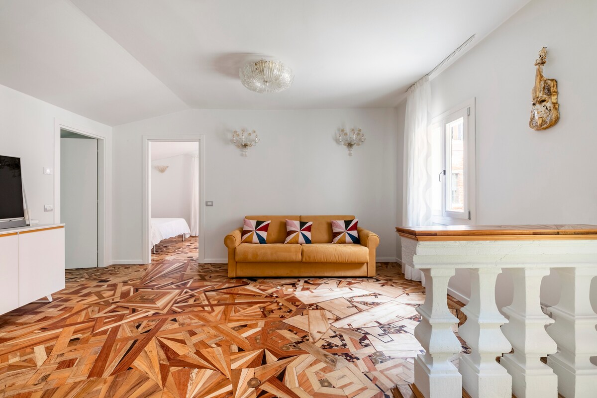 To edinstveno stanovanje s površino 300 m2, ki se nahaja v 4. in 5. nadstropju (brez dvigala) zgodovinske palače v osrčju Benetk, ponuja veličastno mešanico velikosti, sloga in razkošja. Palača, ki se nahaja v mirni slepi ulici v bližini trga sv. Marka, zagotavlja največjo zasebnost. Skrbno zasnovan, vsak kotiček stanovanja izžareva razkošje, njegova strešna terasa pa ponuja osupljiv 360-stopinjski pogled na Benetke za okusna kulinarična doživetja.