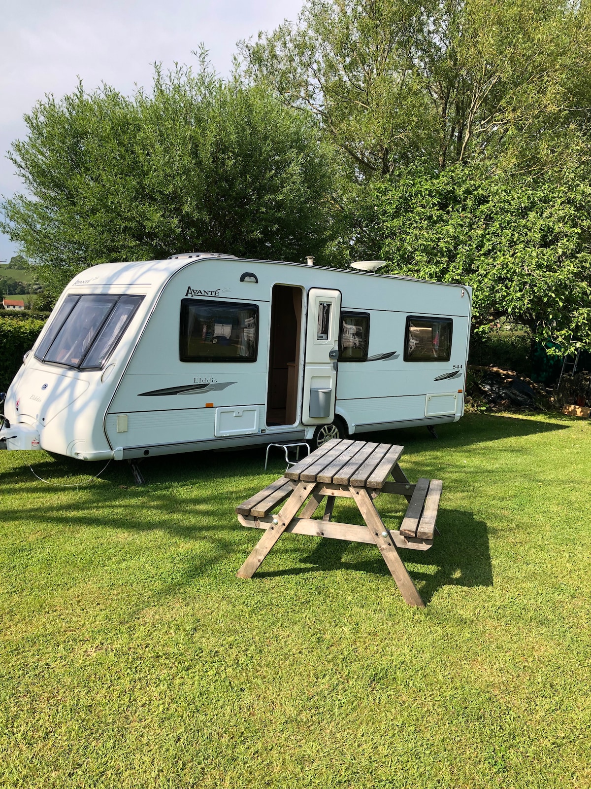 4-posteljna počitniška prikolica, postavljena v igrišče izven omrežja.