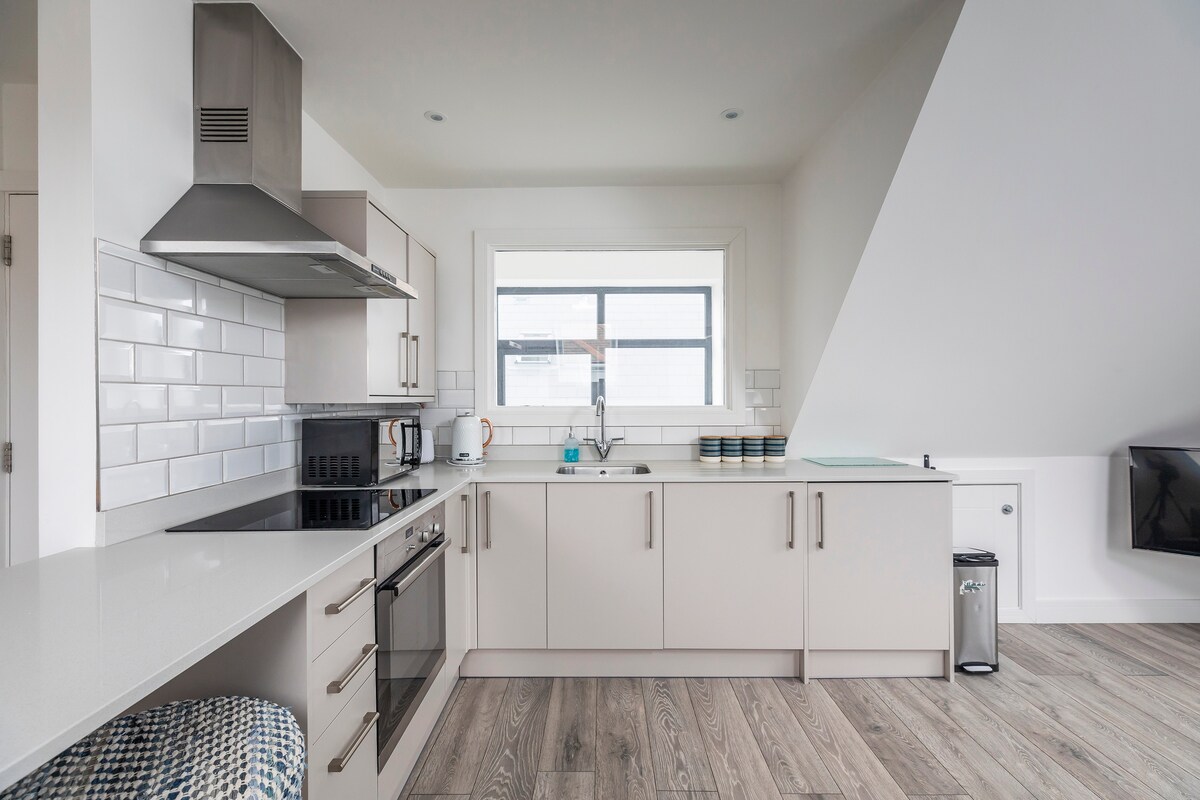 Brezhibno novo stanovanje Boutique 2 Double Bedroom Garden Coach House, dokončano po sodobnem standardu, le nekaj cest od plaže. Dnevna soba ima gorilnik za hlode in raztegljiv kavč. Družinska kuhinja je sodobna s kakovostnimi napravami. Na voljo sta 2 dvoposteljni spalnici, mojster ima razkošno kopalnico, spalnico 2 pa lahko postavite kot dvojno ali veliko zakonsko posteljo. Prha. Južni vrt ima verando. ORP za 2 avtomobila.