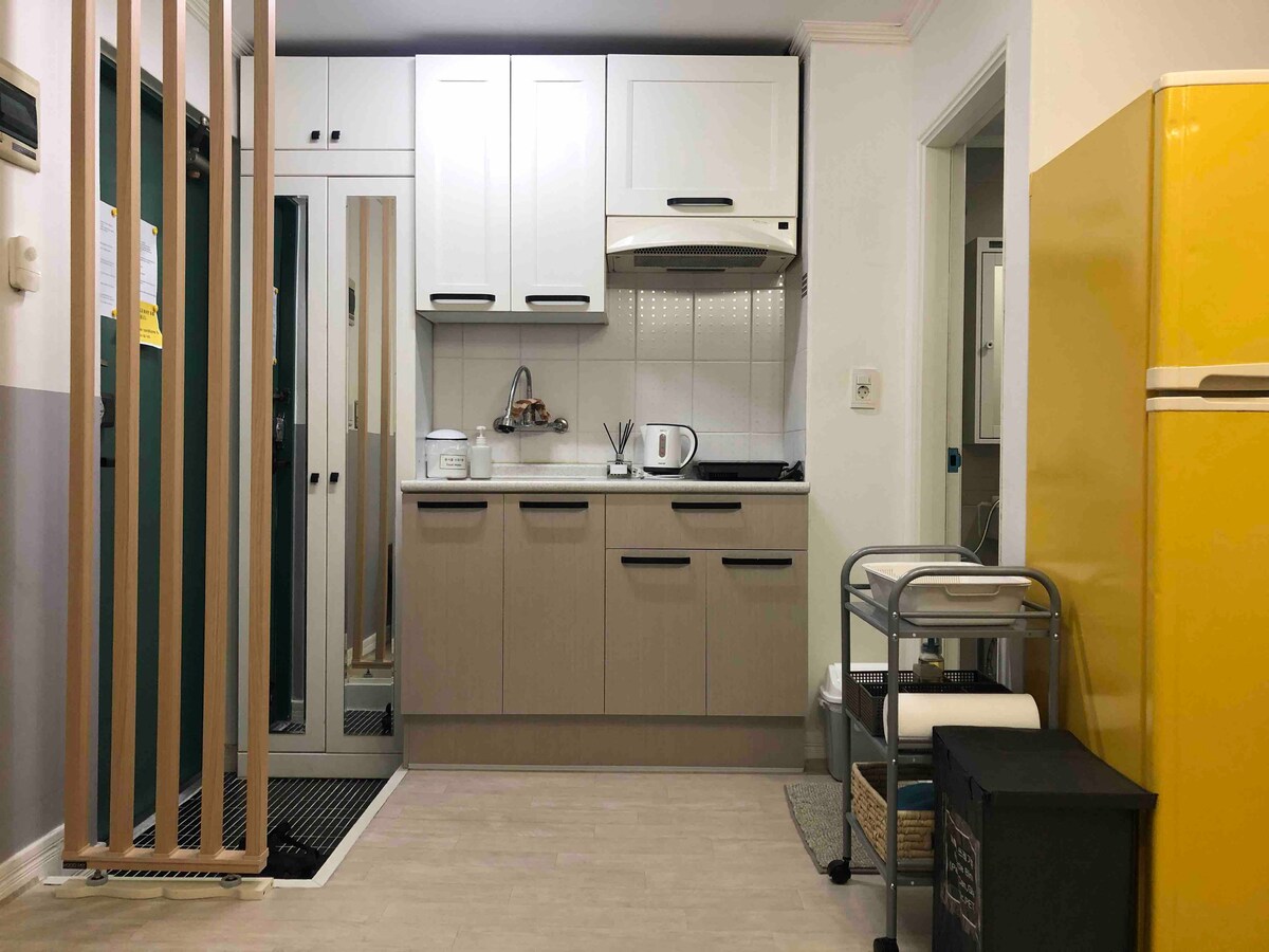 🌿 Pozdravljeni, sem Stayhaeon. To je senzacionalna nastanitev, ki se nahaja v središču Univerze Busan, 5 minut hoje od postaje podzemne železnice in 25 minut vožnje z avtomobilom od letališča Gimhae in postaje Busan. 🚇✈️ Tradicionalno korejsko občutljivost in sodobno vzdušje lahko občutite skupaj s harmonijo pohištva Hanok in sodobnega pohištva. 🌸 Na terasi z umetno travo lahko uživate v opremi za kampiranje in žaru, ko uporabljate ločeno storitev, lahko pa uživate tudi v majhnem kampiranju v mestu. 🌙🏕️ Kuhinja je opremljena z jedilnim priborom, osnovnimi začimbami, kuhalnikom za riž, opekačem kruha, mikrovalovno pečico in aparatom za kavo za enostavno kuhanje. 🍳☕️ V dnevni sobi in spalnici so namizne igre (kot je LumiCube), Netflix, wavve in TV sprejemniki ter zvočniki Bluetooth, da boste lahko preživeli sproščujoč čas. 🎵 Priporočljivo je za družinska potovanja, saj lahko bivate varno in udobno z dojenčkom z👶🏻 nizko vzmetnico. Ustvarite posebne spomine s prijatelji, ljubitelji in družino v tej nastanitvi, ki je od najbolj priljubljenih točk Pusan National University oddaljena peš. ✨