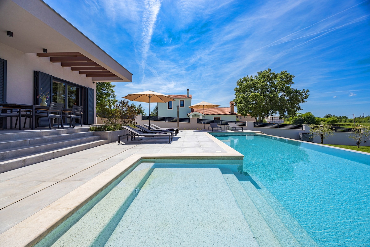 Elegantna vila v bližini Rovinja z bazenom, ki je kot nalašč za fotografiranje, potopljeno masažno kadjo in savno. Prebudite se ob bujnem panoramskem razgledu na dolino. Primerno za pare in družine, le kratek sprehod do pustolovskega parka, narodnega parka Brioni, dinozavrskega parka, srednjeveških mest in lokalne kuhinje. To je pravi zeleni oddih za vsakogar, ki se želi vrniti v naravo z vsem udobjem sodobnega življenja. V celoti opremljen za kuhanje in zabavo na 2600 m2 vrta (nogomet, hitra žoga, badminton in zabava v bazenu) za vaše otroke in najdražje.