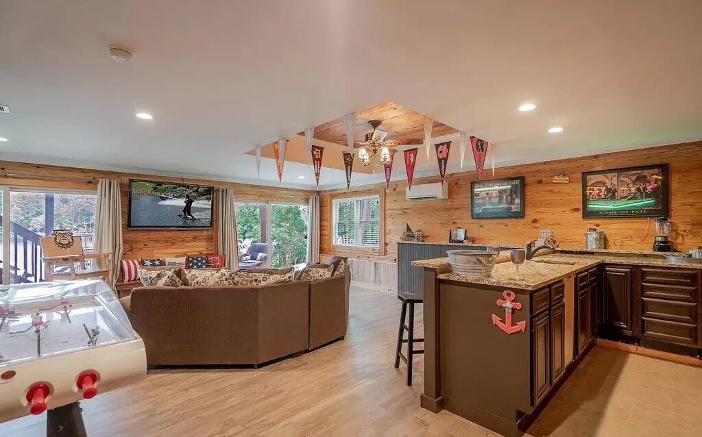 *License # STR2026-066 Morning begins in a quiet Lake Oconee cove where paddle boards and kayaks rest beside the dock, ready for a slow start on the water. This four bedroom waterfront home blends lakeside outdoor living with multiple gathering spaces inside, including a lower level game room and bunk retreat. Evenings settle around the shoreline fire pit or on the deck overlooking the cove, with calm water reflecting the lights of the home as the day fades.