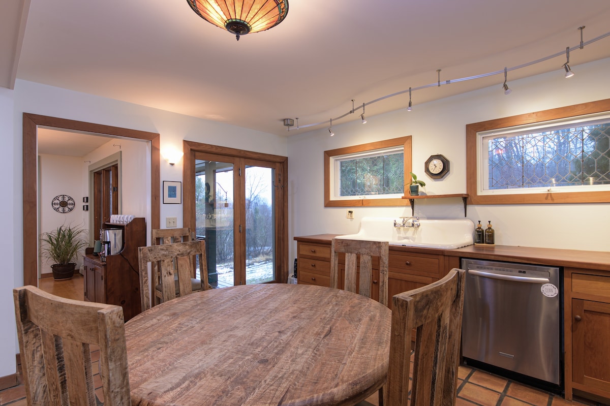 Honeycrisp Cottage a Tiny Timber Frame je svetlo, energetsko učinkovito bivališče, ki se nahaja na 9 hektarjih s pogledom na čudovito gozdnato goro in poti, ki jih lahko raziščete vzdolž potoka. Miren oddih, opremljen z dnevno sobo, zakonsko posteljo (King), predelanim stanovanjem z zakonsko posteljo (Queen), polno kuhinjo in kopalnico. *V sklopu namestitve je prepovedano kajenje Sneg - 50 min Okemo - 50 minut Stratton - 1 ura Killington - 1 ura in 20 minut