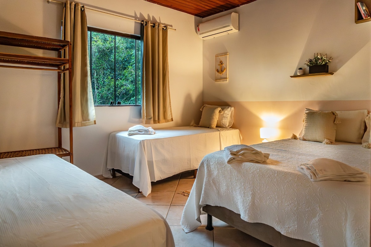 Najboljša lokacija s čudovitim razgledom na morje in sončni vzhod! Samo 10 minut hoje od plaže in 3 minute od središča mesta Arraial, dovolj daleč, da se izognete hrupu. Poleg Rua do Mucujê, kjer se sreča vse nočno življenje Arraiala. Najboljše restavracije in bari so oddaljeni manj kot 5 minut. Ta hiša lahko sprejme do 6 oseb. Ima 2 kopalnici, deljeno klimatsko napravo v obeh nadstropjih, opremljeno kuhinjo, velik hladilnik in LCD TV. *Zajtrk je na voljo, vendar ni vključen v dnevno ceno.