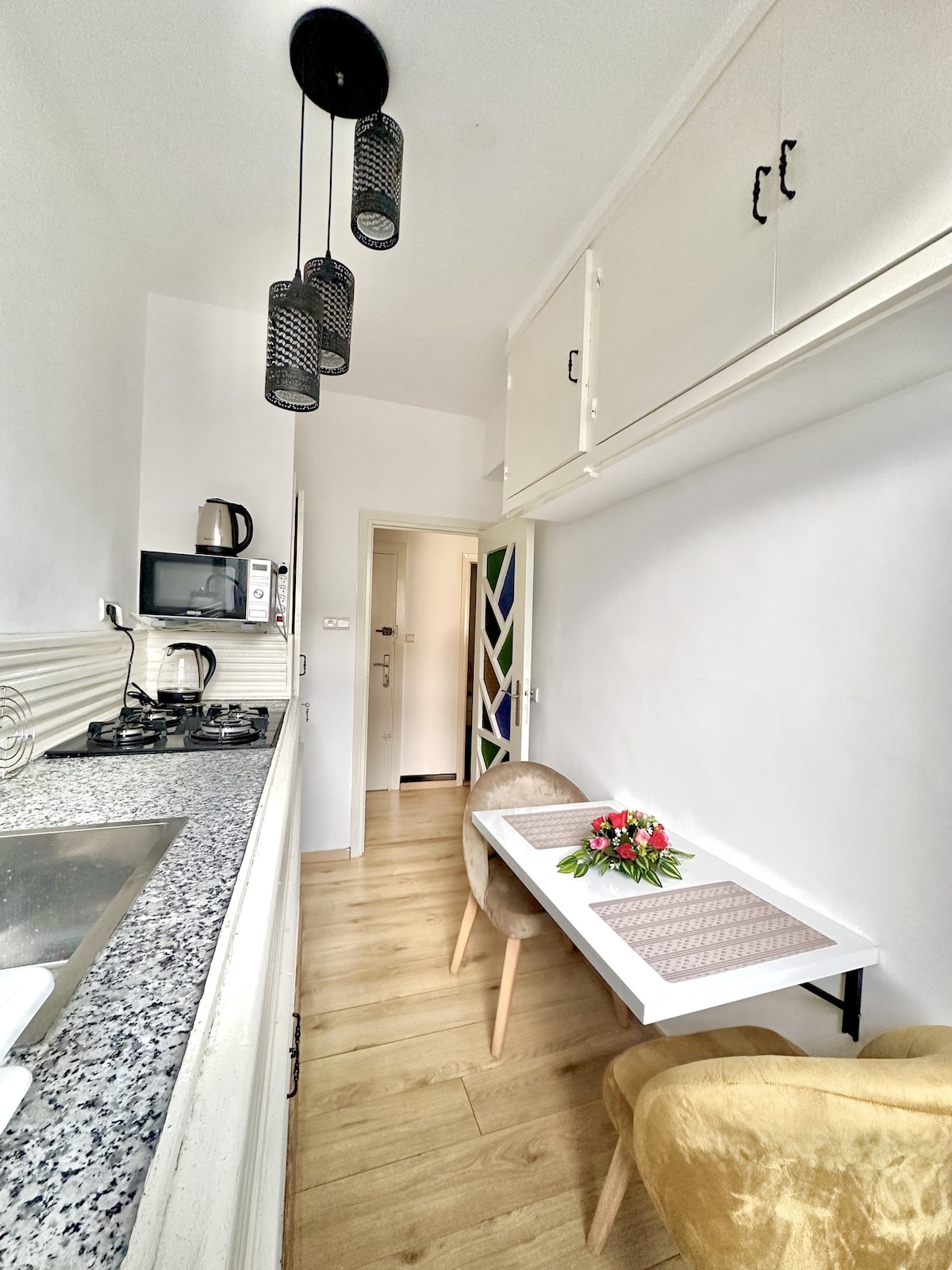 Sodoben in gostoljuben studio se nahaja v prestižnem okrožju Hassan in ponuja vse udobje, ki ga potrebujete za prijetno bivanje, bodisi za sproščen oddih ali poslovno potovanje. Udobna postelja za optimalen počitek Funkcionalna kuhinjska niša (štedilnik, hladilnik, pribor itd.) Zasebna kopalnica s prho Klimatska naprava/ogrevanje za vaše udobje v vseh letnih časih Hiter Wi-Fi (z optičnimi vlakni), da ostanete povezani Delovni prostor za poslovne potnike