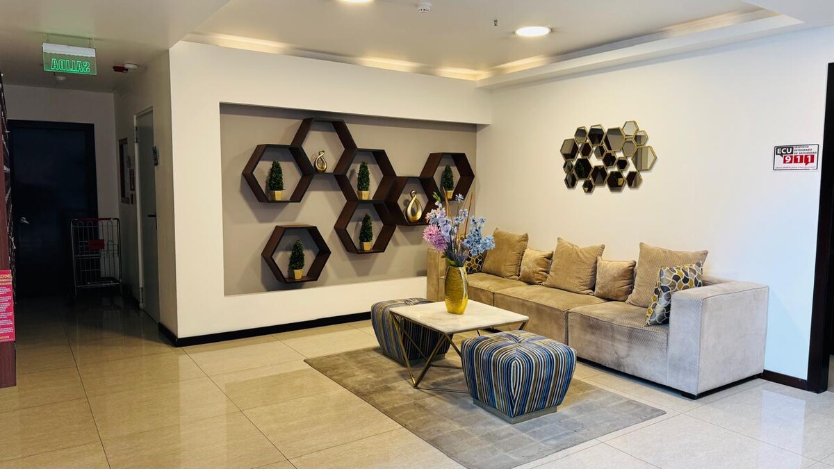 Quito, Ecuador Your booking will be in a quiet and safe environment We are a few steps from Parque de la Carolina, which is very famous in Quito for being close to the financial, commercial and tourist area. It is close to banks, shopping centers, pharmacies, supermarkets and with all services included such as: Wifi Netflix pool sauna, Turkish, Hydromassage gym, business center, lounge bar: pool table, Play area: play station Children's area Terrace with 360 view