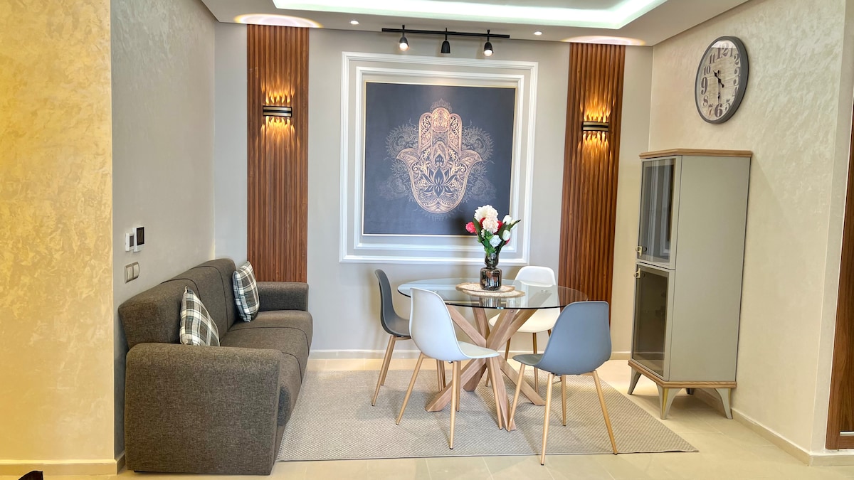 Popolnoma novo, čudovito, dobro opremljeno stanovanje s širokopasovno povezavo, Netflixom, IPTV... tiho in varno. To stanovanje ponuja sproščujoče trenutke za vso družino z brezplačnim parkiranjem v sklopu prenočišča. 500 m od velikega Carrefour Saléja, trgovin z živili je le kratek sprehod stran, da opravite nakupovanje. Blizu Burger Kinga, hiše Nigiri, Adidasa, fitnes parka,frizerja in hamama...200 metrov od morja, kjer so kavarne s panoramskim razgledom na ocean!Ni za kaj
