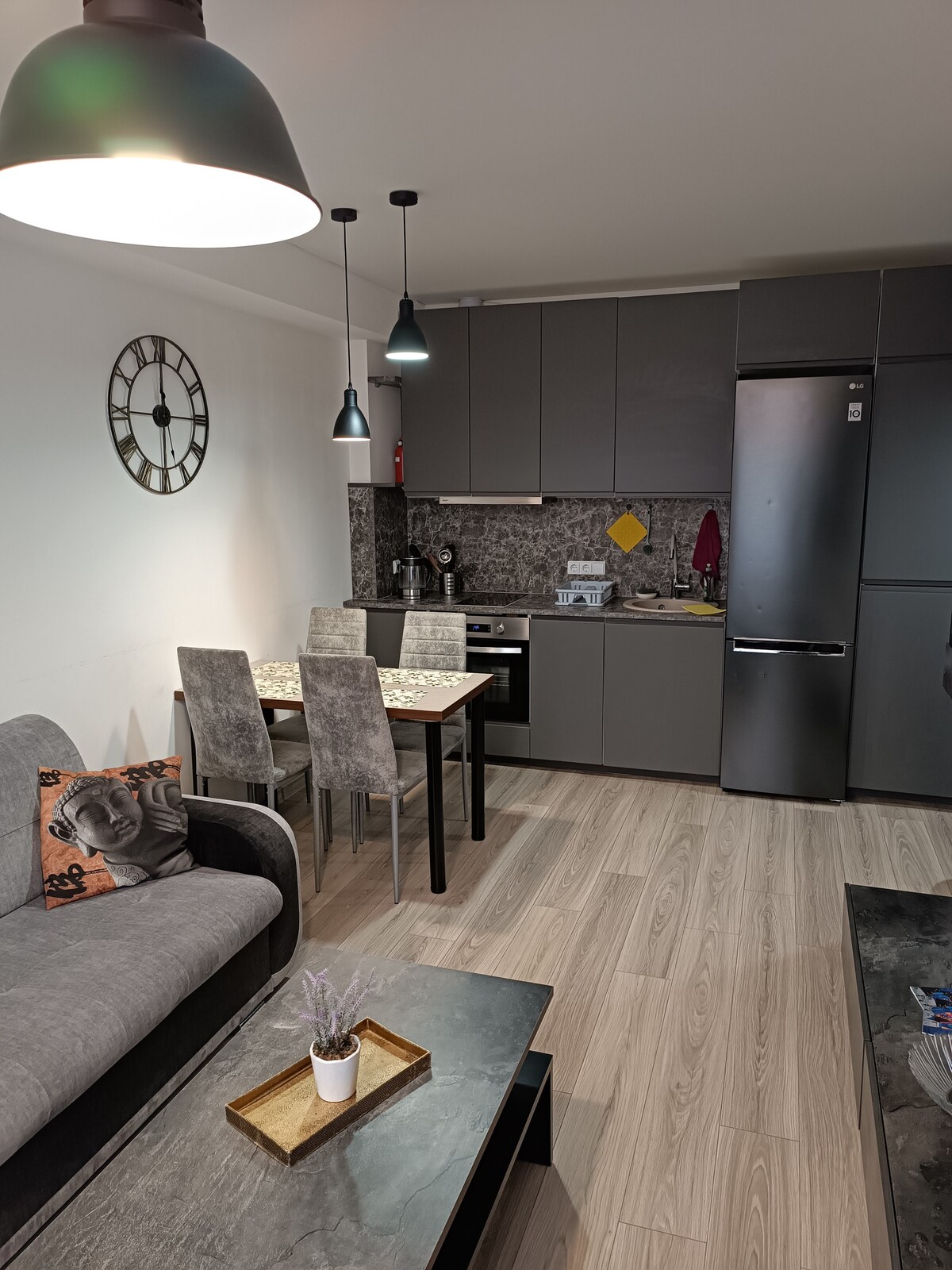 Brand new, modern flat with quality finish in a center of the little town. Located on a first floor so easy access from the street (around 15 steps). Fully equipped open kitchen with washing machine.