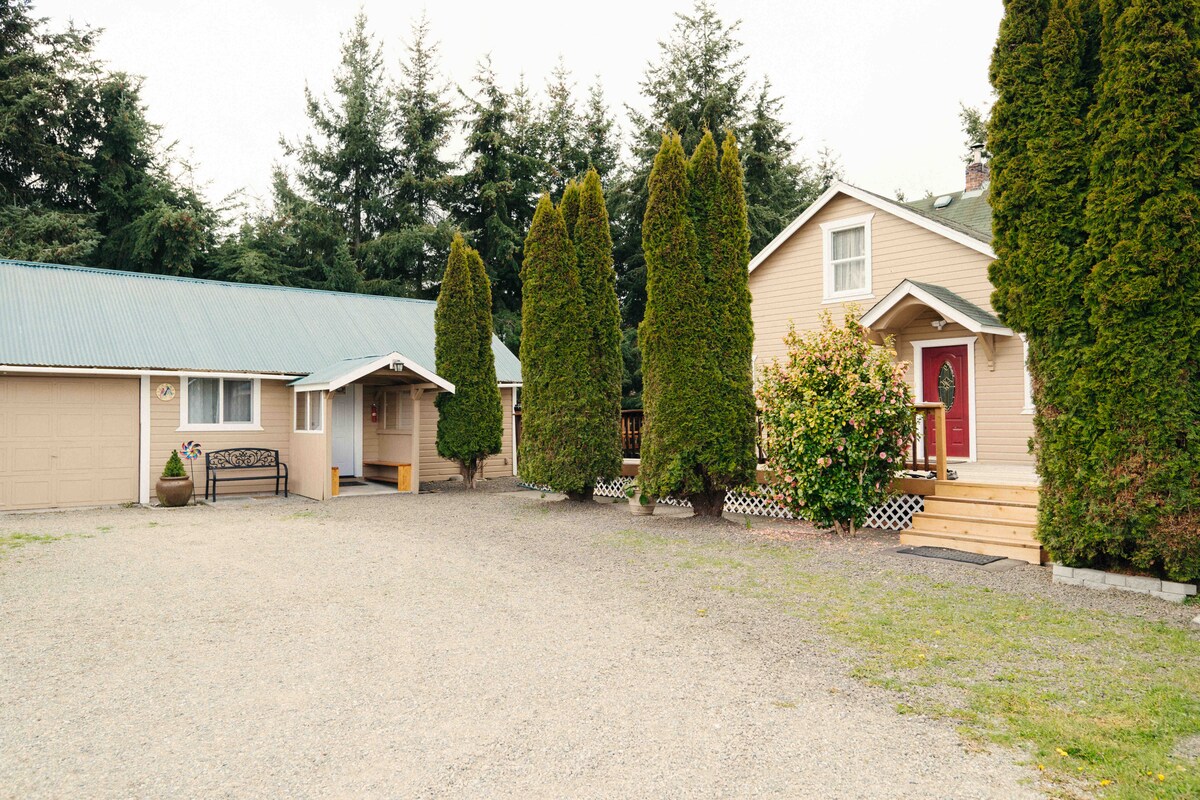 Mirna hiška na deželi, kjer lahko uživate v spokojnosti Sequima z lokacijo, ki je kot nalašč za vsako pustolovščino, ki jo imate v mislih. Nahaja se tik ob ulici Hi-101 in je kratek izlet v središče Sequima ali pa celo uživajte v mestu Port Angeles, ki je oddaljen le 20 minut vožnje. Če vam je ljubša slikovita pot, se odpravite desno od naše vožnje do stranije Sequim, kjer boste našli vrsto pogledov na naravo, kot so naši osebni favoriti »Cline Spit« ali »Voice of America«.