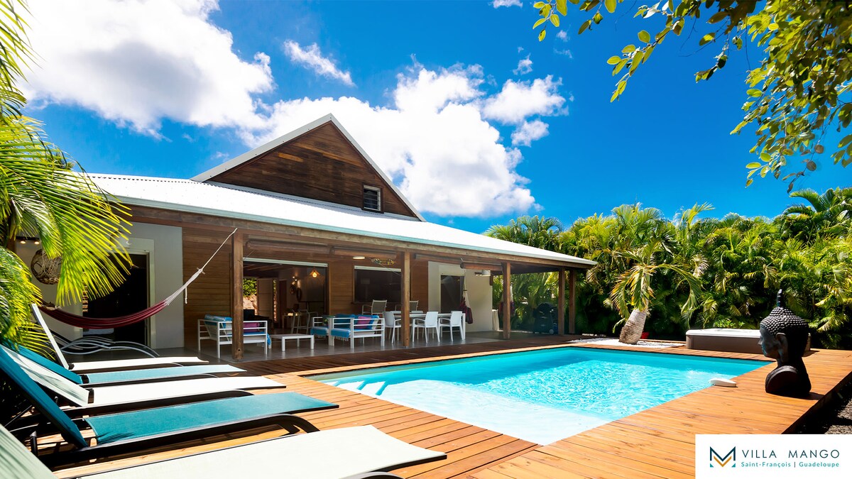 Villa Mango (nekdanji Eden Green) se nahaja na priročni lokaciji v kraju Saint-François, 750 metrov od plaže Les Raisins Clairs in Manganao. Vila ponuja razkošno opremo s 4 zvezdicami, ki jo sestavljajo prostorna dnevna soba, ki je odprta v opremljeno kuhinjo, in pokrita terasa z velikim otrokom prijaznim bazenom in masažno kadjo za 5 oseb. Vsaka od 3 spalnic ima svojo kopalnico z WC-jem. Vse so klimatizirane in enake velikosti. Podrobnosti o opremi v opisu.