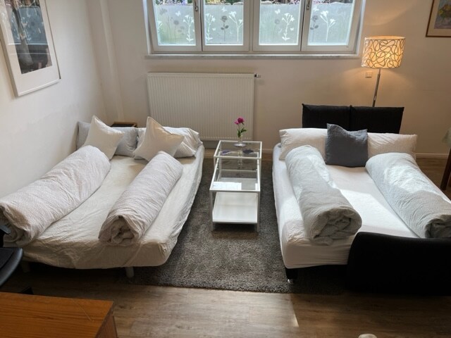 Dobrodošli, veselimo se srečanja z vami. Čaka vas majhen košček »doma«. Stanovanje ima ločen vhod, kuhinjo, kopalnico s prho:stranišče, majhno teraso. Zjutraj lahko slišite ptice, ki cvrčijo ob skodelici kave ali tečejo v bližnjem parku, končate dan v »grščini« (150 m) zvečer. Stanovanje se nahaja na podeželju, vendar le 15 min. od centra. Sejmi v Münchnu so oddaljeni 20 min. U-Bahn poteka neposredno do Oktoberfesta v 15 minutah. Avtocesta je oddaljena 5 min.