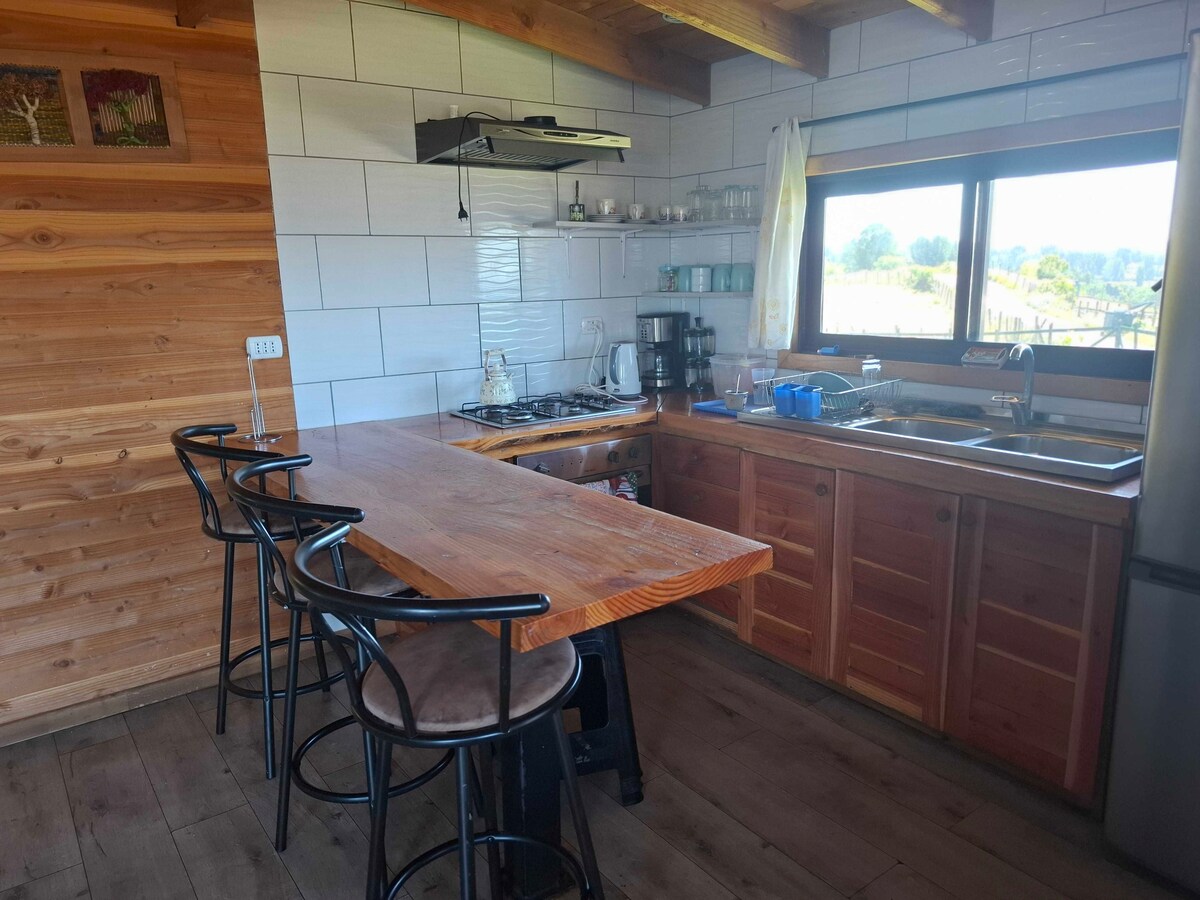 Cabaña individual, con patio, estacionamiento y ambiente totalmente privado. Cuenta con acogedoras habitaciones, cocina e intalaciones de primer nivel. Estarás rodeado de naturaleza, cerca de todos los atractivos naturales. A 3 minutos de la playa de Calcurrupe, río, zonas de trekking, centros de ventas