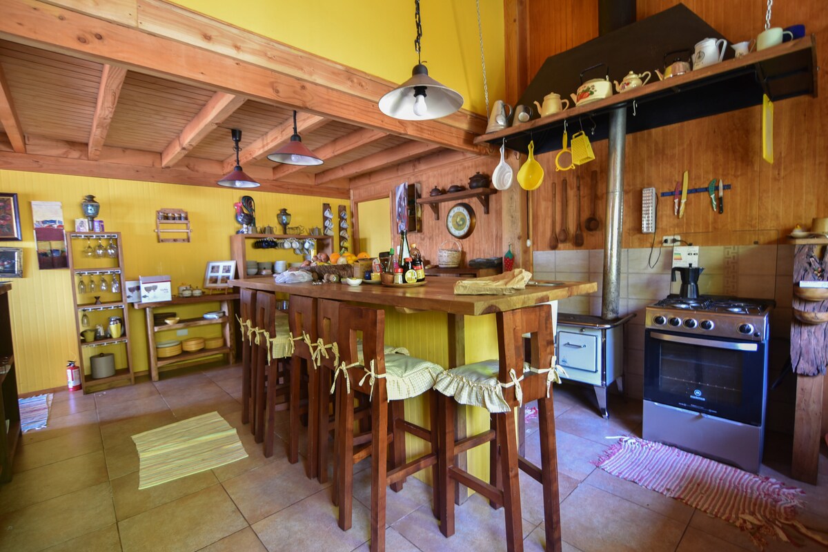 A solo 10 minutos de Huilo Huilo y otros atractivos turísticos. Cabaña para 4 personas full equipado y con conexión a y wifi El comedor cuenta con microondas, licuadora, vajilla completa, utensilios y TV con wifi. Además, quincho y áreas comunes, compartidas con los demás huéspedes. Piscina techada (no temperada) Tinaja y sauna privados a orilla del estero (servicio adicional, reserva con 1 día de anticipación). Incluye sábanas y toallas. Estadía mínima: 2 noches La calefacción es con bosca