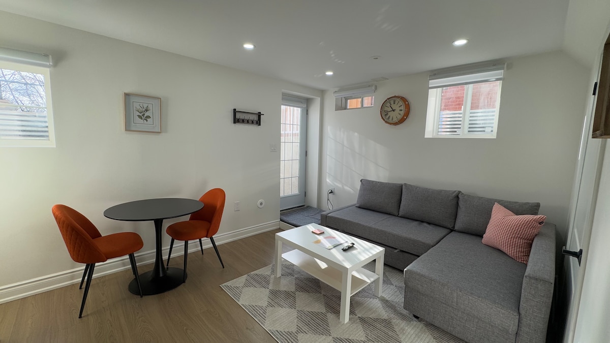 Dobrodošli v našem udobnem kletnem stanovanju! Sodoben Airbnb se nahaja v mirni stanovanjski soseski, 40 min vožnje od središča Toronta in eno uro od Niagarskih slapov. Dobro osvetljen prostor ima udobno zakonsko posteljo, dovolj prostora za shranjevanje v prostorni omari in čudovito oblikovano notranjost z naravno svetlobo, ki poplavlja skozi velika okna. Opomba: na voljo imamo 2 enojni zložljivi vzmetnici, ki ju lahko postavite na tla v dnevni sobi. Na voljo so dodatna posteljnina in blazine.