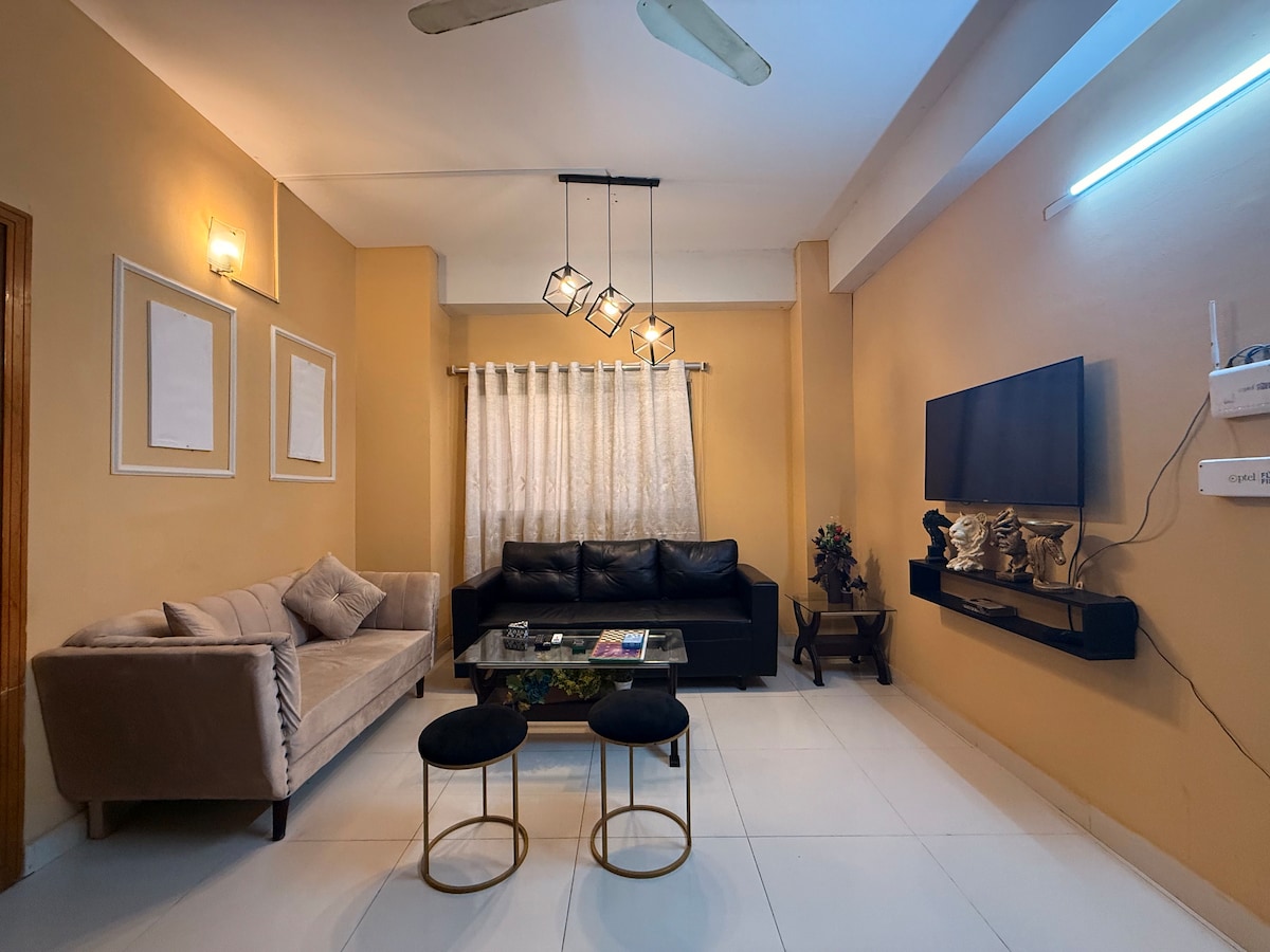 Sapphire je eleganten 1 BHK z veliko prostora, miru in udobja. Zasnovan je tako, da zagotavlja sproščujoče doživetje v vseh letnih časih. Sprejme 2-4 osebe naenkrat, zaradi česar je kot nalašč za družine. Stanovanje je v celoti opremljeno z vsemi vašimi potrebami. Na voljo je prenosni delovni prostor, ki ga lahko postavite v dnevni sobi ali na balkonu, kjer lahko delate na daljavo ob pomirjujoči skodelici kave. Rezervirajte to čudovito bivališče še danes in uživajte v veliko prostora za zabavo.