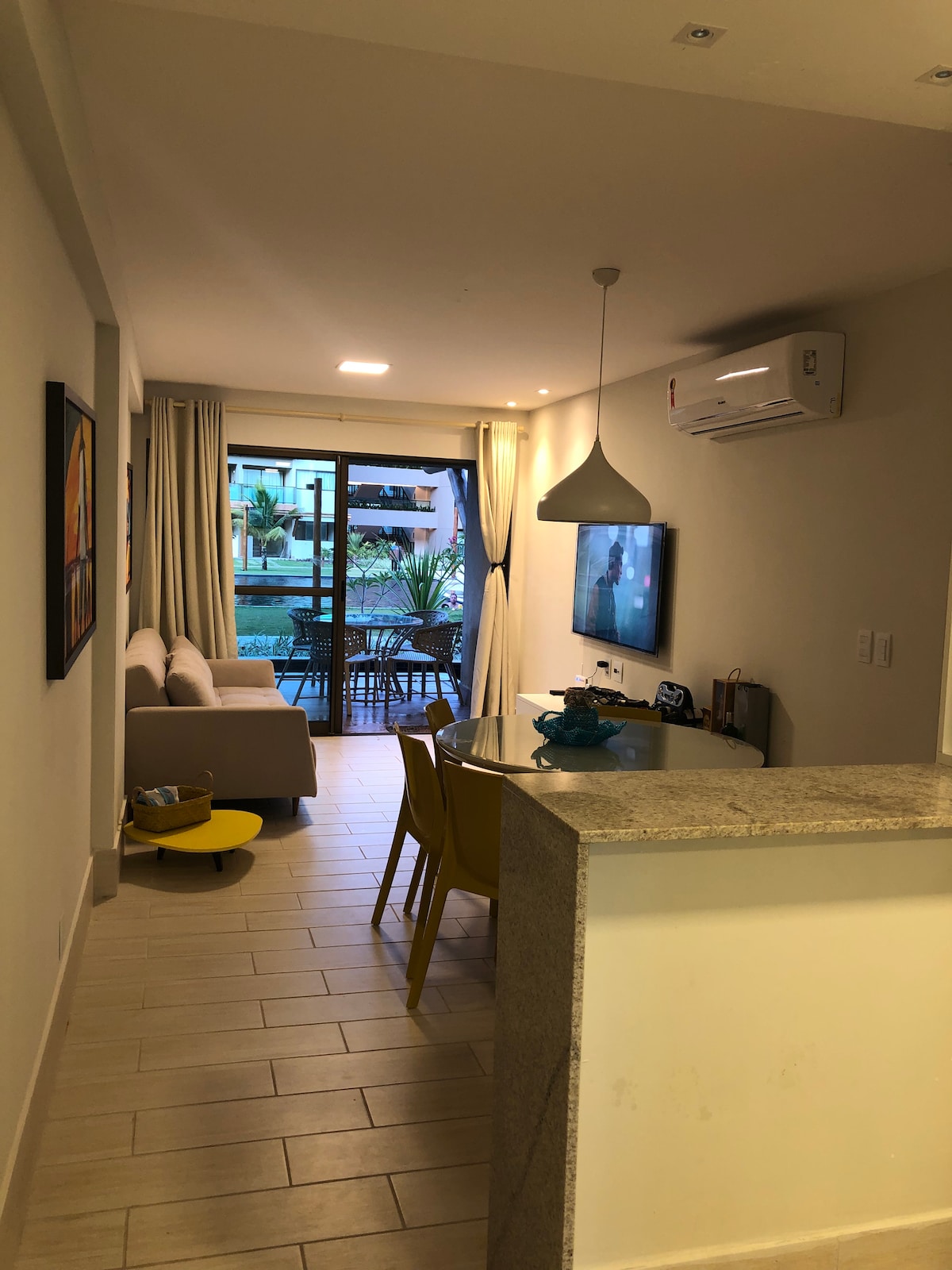 Apartamento amplo de 67m², ideal para grupos. Conta com suíte de casal equipada com ar-condicionado, SmartTV e guarda-roupa, 2º quarto com triliche, cama de solteiro e ar-condicionado. Sala de estar com sofá-cama, ventilador de teto, SmartTV e Wi-Fi | Cozinha completa (fogão, forno, eletros) Varanda espaçosa com mesa de refeições, sofá, churrasqueira, oferecendo vista para a piscina e parcial do mar. Forneço roupa de cama, lençóis, toalhas de banho e rosto, panos de prato e de chão.