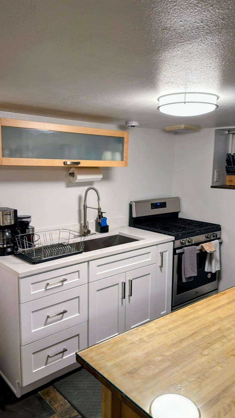 New Construction 1 bed apartment in Downtown Kirkland! Custom cabinets, quartz counters & stainless appliances! Beautiful salvaged & refinished fir flooring. Adorable bath w/ basket weave tile & soapstone counter! Private washer & dryer. WIFI & Smart TV. Vaulted ceilings, skylights & AC! This completely separate & private new construction apartment was completed in 2020 and is located above our detached garage. Perfect for short or long term stays. Live in the heart of Kirkland!