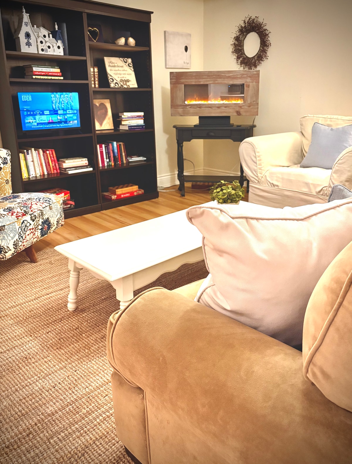 This charming, beautifully appointed private apartment evokes a sense of calm and effortless elegance where cottage-core decor meets modern comfort. A cozy and impeccably clean retreat thoughtfully designed for rest and relaxation. Featuring an open area living space with inviting chairs and sofa with plush pillows, a perfect place for unhurried conversations by the electric fireplace. The bedroom, a restful escape with high quality mattress & linens, plush bedding and pillows for comfort.