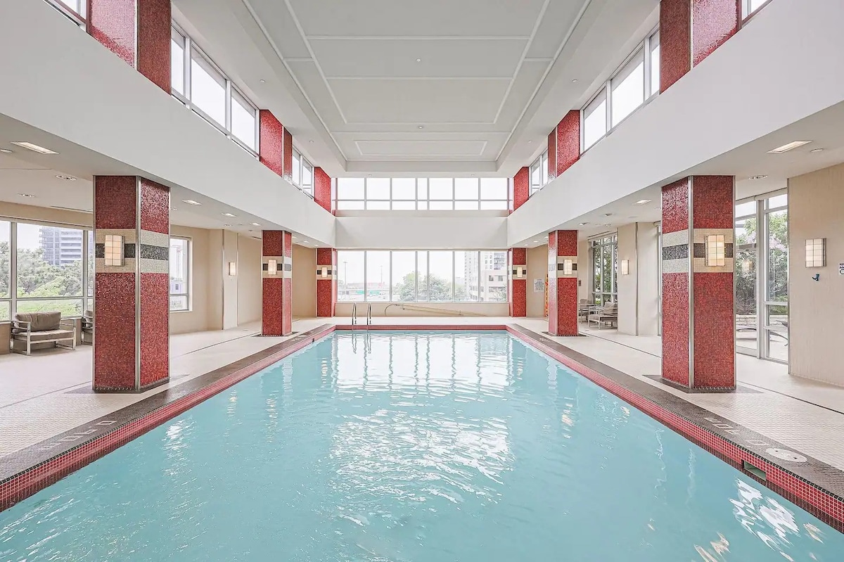 Uživajte v bivanju v Torontu v CELOTNEM stanovanju! Sprostite se v tej osupljivi in sodobni enoti s čudovitim razgledom na sončni zahod. Stavba ponuja veliko opreme, vključno s hišnim upraviteljem s polnim delovnim časom, brezplačnim parkiranjem in brezplačnim dodatnim parkiranjem za goste, notranjim bazenom, masažno kadjo, savno in popolnoma opremljeno telovadnico. Stanovanje ima popolnoma opremljeno kuhinjo (vključno z Nespresso), veliko televizijo z aplikacijami za pretočno predvajanje, kamin, balkon, pralni in sušilni stroj ter brezplačen Wi-Fi.
