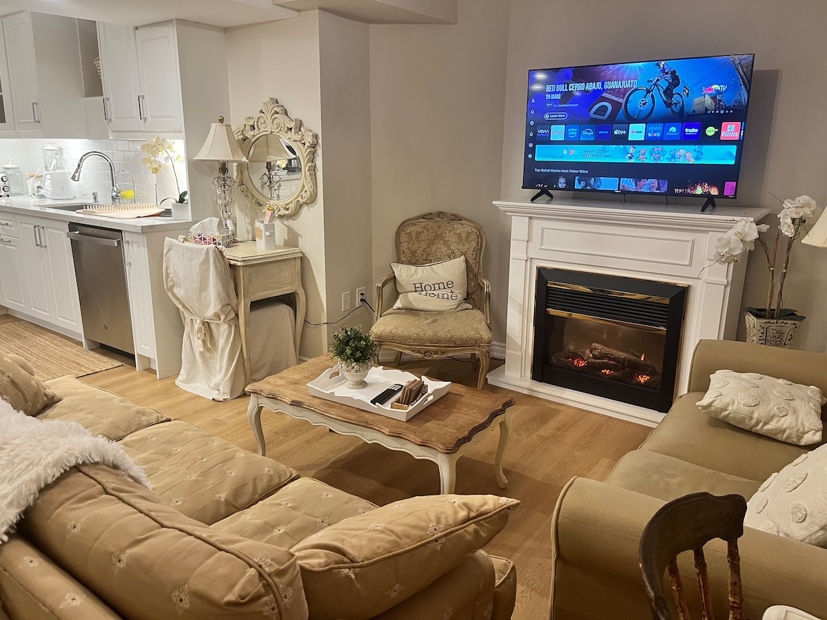 Enjoy easy access to stores, restaurants and entertainment from this perfect location. Only 5 min. drive to GO Train & Bus Terminal with quick, convenient transport to Downtown Toronto, Canada’s Wonderland, etc. This lower level guest suite is fully equipped with own laundry, kitchenette with mini fridge, Induction 2 burner Cook Top Stove, microwave, toaster and coffee maker. Cozy Fireplace, 60” screen HD TV and Luxurious King Size Bed Safe Neighbourhood with walking trails and parks.