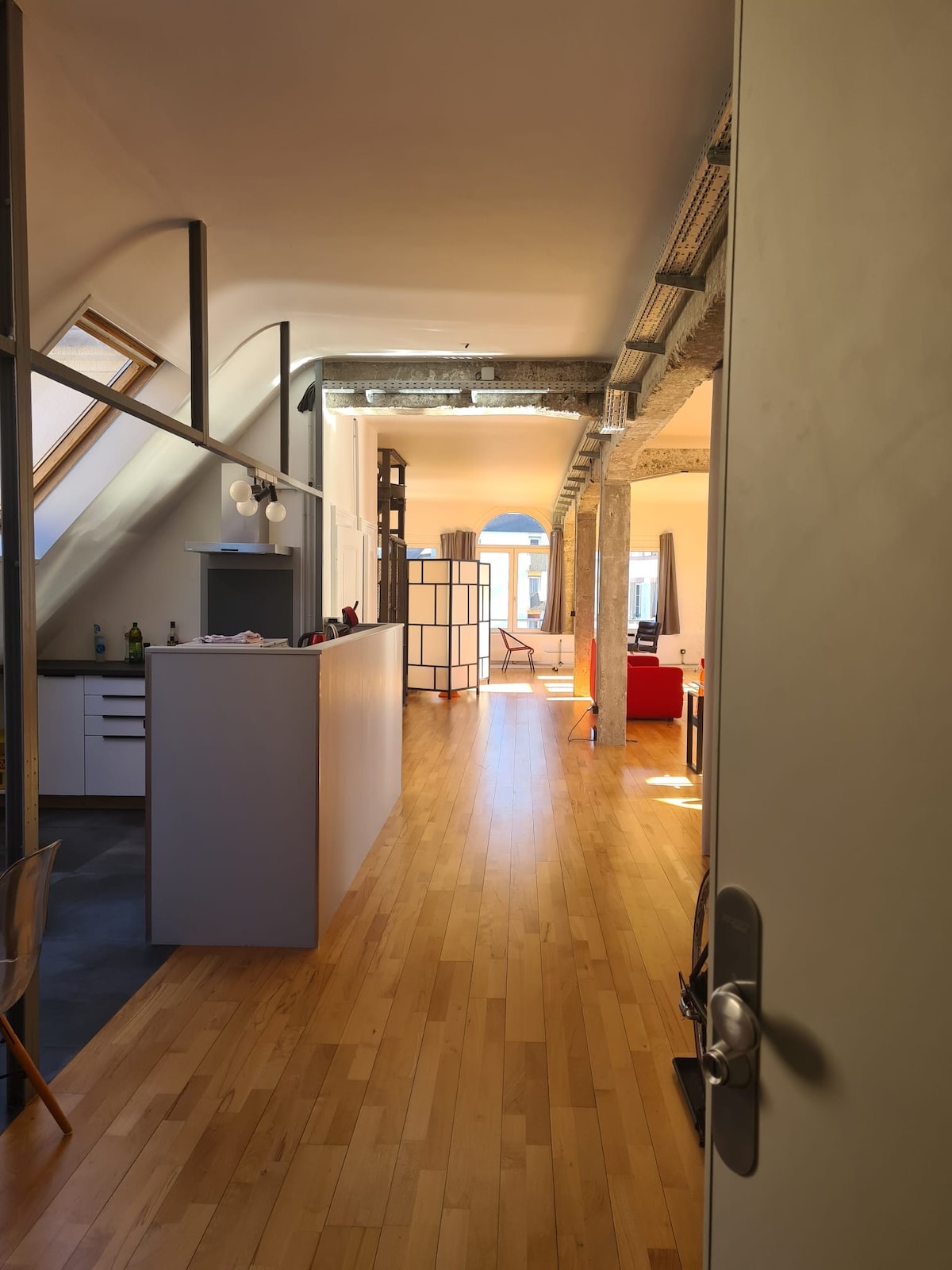 Pravo podstrešje in ne prenovljeno »mansardni slog« (v stavbi, zgrajeni leta 1911 in je sestavljena predvsem iz blokov za različne komercialne dejavnosti) 120 kvadratnih metrov, zelo svetla, oklepna vrata, trdna parketna tla, 4 dobrodošlice za goste, zelo enostaven dostop (2 minuti hoje od železniške postaje, dostop do avtoceste 500 metrov, hiter dostop do tramvaja), možnost javnega parkiranja 300 metrov, ki se nahaja 12 minut hoje od katedrale Strasbourg.