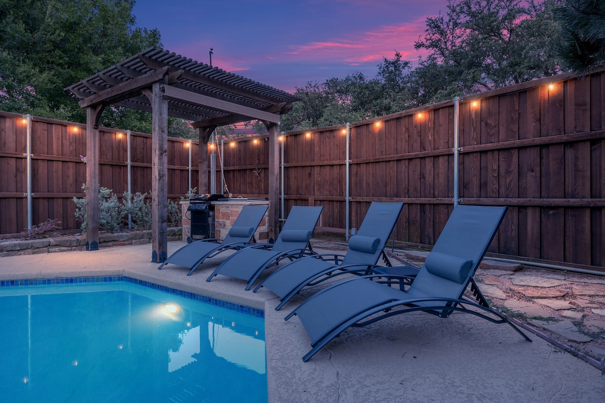 Doživite ta edinstven dragulj, ki se nahaja v Colony v bližini jezera Lewisville, Hawaiian Waters, Grandscape, PGA in številnih restavracij. Ta 3-sobni dom je udoben in edinstveno zasnovan za zabavo in sprostitev v zaprtih prostorih na prostem. Kuhinja je opremljena z osnovnimi kuhinjskimi pripomočki, brezalkoholnimi pijačami, prigrizki in Keurigom. Uživajte na čudovitem dvorišču z igrami na prostem, žarom in jedilnico pod osvetljenim paviljonom. Potopite se v vročo kad za 6 oseb, ki jo nadzira temperatura, ali pa se sprostite v zunanjem salonu.