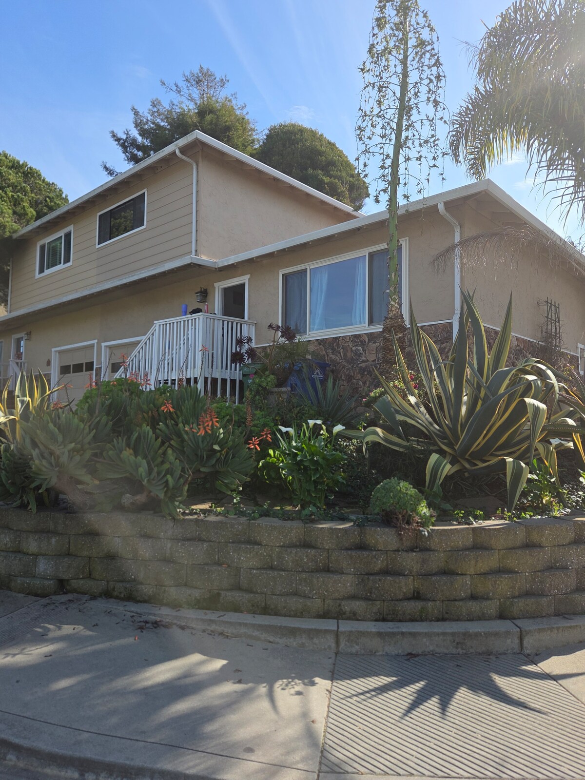 Our guest suite is on the lower floor of our house in a quiet neighborhood and is a 15 minute walk and 5 minute drive to a beautiful beach. There are two restaurants 3 blocks from our house, both have views of the ocean and outdoor seating. The suite has a bedroom with a king size bed and closet; also a private bathroom and den. Den is equipped with refrigerator, coffee maker, sink, flat screen RokuTV, and microwave. Patio has gas fire pit, small deck, waterfall feature, & hot tub.
