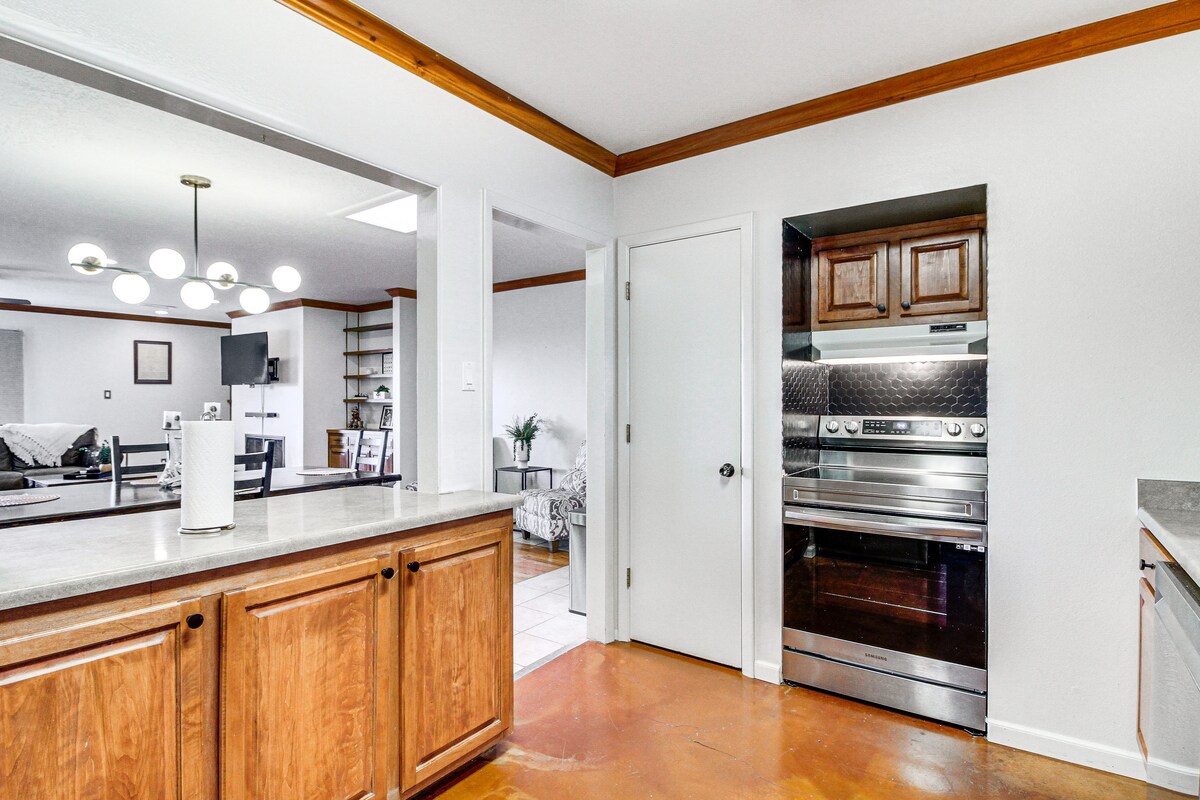 Fantastični razgledi in odličen družinski prostor v novozgrajenem domu! To prenočišče je popolnoma opremljeno za kratko bivanje za eno noč ali daljše bivanje. Ta prostor je dobro opremljen z vsemi potrebščinami v kuhinji, polnim hladilnikom, štedilnikom, mikrovalovno pečico, aparatom za kavo (Keurig), opekačem kruha itd. Prenočišče ima eno glavno spalnico z zakonsko posteljo, 55-palčno pametno televizijo, povezano kopalnico z namakalno kadjo in ločeno prho.
