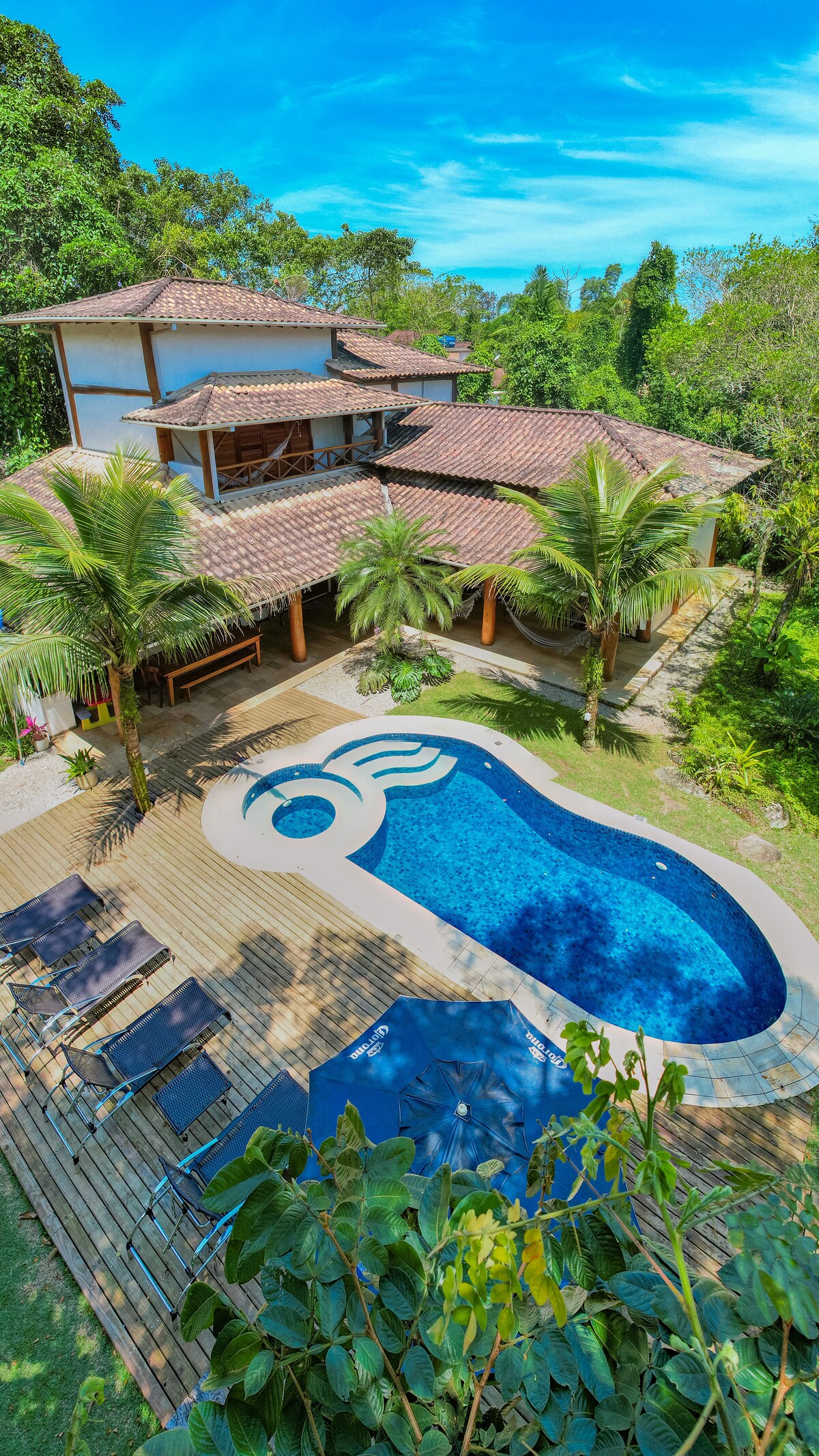 A place with the most incredible view of the sea, views of Flamengo Bay, Anchieta Island, Santa Rita Beach, Lamberto, Ribeira and others… With a private trail in the Atlantic Forest, 2 incredible viewpoints, small waterfalls with crystal clear water! With security and privacy, the Greece-themed house has a comfortable and structured 300m2, airy and fresh and with new air conditioning in all bedrooms. The closest beach is Lamberto Beach, you have to walk 400m, but we recommend going by car!