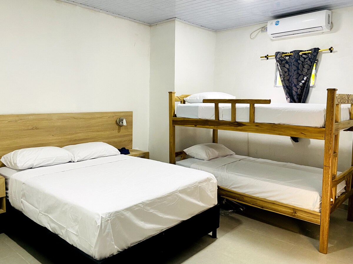 ŠTIRIPOSTELJNA SOBA Z 2 POSTELJAMA INDV + 1 DBL POSTELJA/ZASEBNA KOPALNICA Hotel Emerawaa je idealen kraj za sproščeno in udobno bivanje. Podeželsko okolje za uživanje v miru narave. Ima bazen, kiosk, zelene površine in zasebno parkirno mesto v sklopu objekta. Vaše bivanje v Emerawai bo nepozabno. EMERAWAA pomeni Descanso en Wayuunaiki, jezik avtohtonega avtohtonega kraja La Guajira