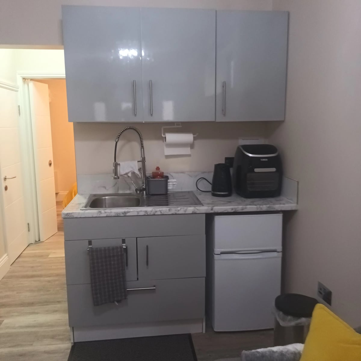 Soba ima lastna vhodna vrata. Ima zakonsko posteljo, prho in kuhinjo (čaj, kava, žitarice itd.) s hladilnikom, mikrovalovno pečico in enojno indukcijsko kuhalno ploščo. Na voljo so kavč, televizija in miza z dvema stoloma. Do postaje Claygate je približno 15 minut hoje. Vlaki neposredno v London Waterloo (35 min) in Guildford. Claygate ima lokalne trgovine in CoOp, več gostiln in restavracij ter smo v bližini avtobusne postaje s pogostim avtobusnim prevozom do Kingstona za glavne trgovine.
